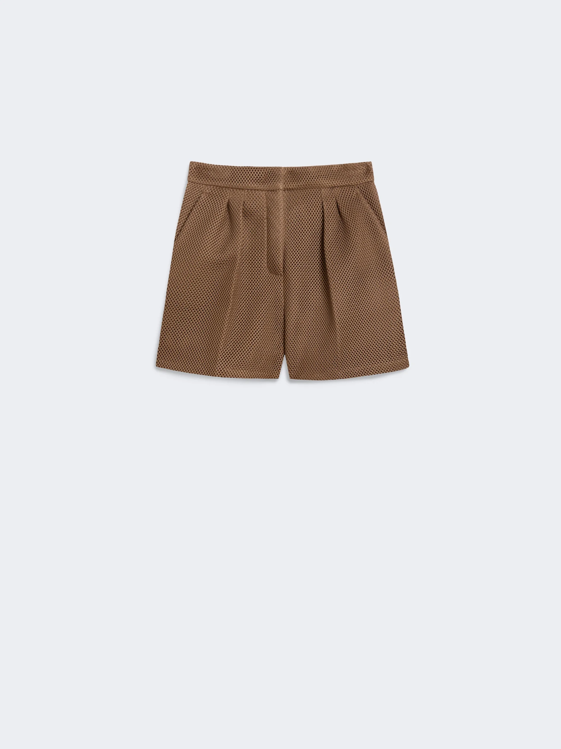 DETAILS High-waisted shorts with pleats that give volume to the garment. Shorts in thick technical mesh Fastening with a wide waistband tab, zip fly and small hooks Slant pockets at the sides Trouser crease Leather logo label on the waist back Lined COMPOSITION AND CARE Jersey fabric 100% polyester; lining 59% viscose, 38% cotton, 3% elastane. Do not wash; do not bleach; do not tumble dry; cool iron; professionally dry clean perchloroethylene - mild process; do not wet clean.; iron with a cloth between. Distributed by Max Mara S.r.l., registered office in Reggio Emilia (Italy), Via Giulia Maramotti 4, 42124 (IT)