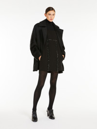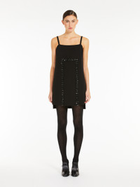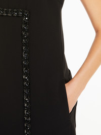 DETAILS Short sleeveless dress in cady, embellished with an embroidery of stones and jet on the front. Featuring a straight silhouette with a square neckline and fine straps. Includes in-set pockets on the sides, patch pockets on the back and an asymmetric hem with small side slits. Lined, with a back concealed zip fastening. COMPOSITION AND CARE Fabric 64% triacetate, 36% polyester; lining 95% acetate, 5% elastane; - exclusive of decoration. Do not wash; do not bleach; do not tumble dry; cool iron; professionally dry clean perchloroethylene - mild process; do not wet clean.; do not iron the decoration.; turn the articles inside out before washing. Distributed by Max Mara S.r.l., registered office in Reggio Emilia (Italy), Via Giulia Maramotti 4, 42124 (IT)