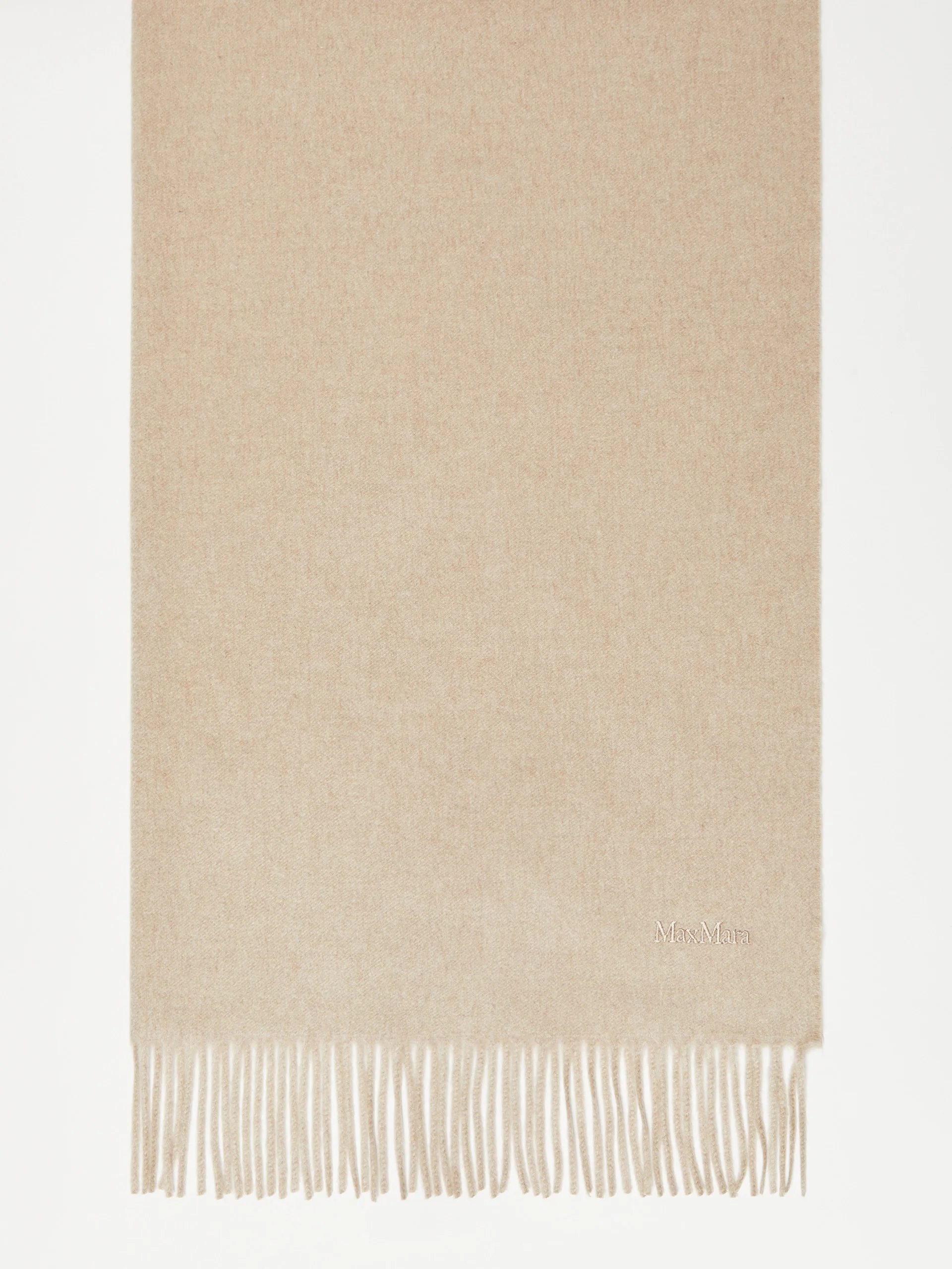 DETAILS Stole with characteristic monochrome design, embellished with delicate, tonal embroidered Max Mara lettering at the bottom. Stole in fine sable-look pure cashmere yarn Fringed shorter sides Size: 70 x 196 cm COMPOSITION AND CARE 100% cashmere. Do not wash; do not bleach; do not tumble dry; cool iron; professionally dry clean perchloroethylene - mild process; do not wet clean.; to be ironed on reverse.; to be ironed with no steam.; iron with a cloth between. Distributed by Max Mara S.r.l., registered office in Reggio Emilia (Italy), Via Giulia Maramotti 4, 42124 (IT)