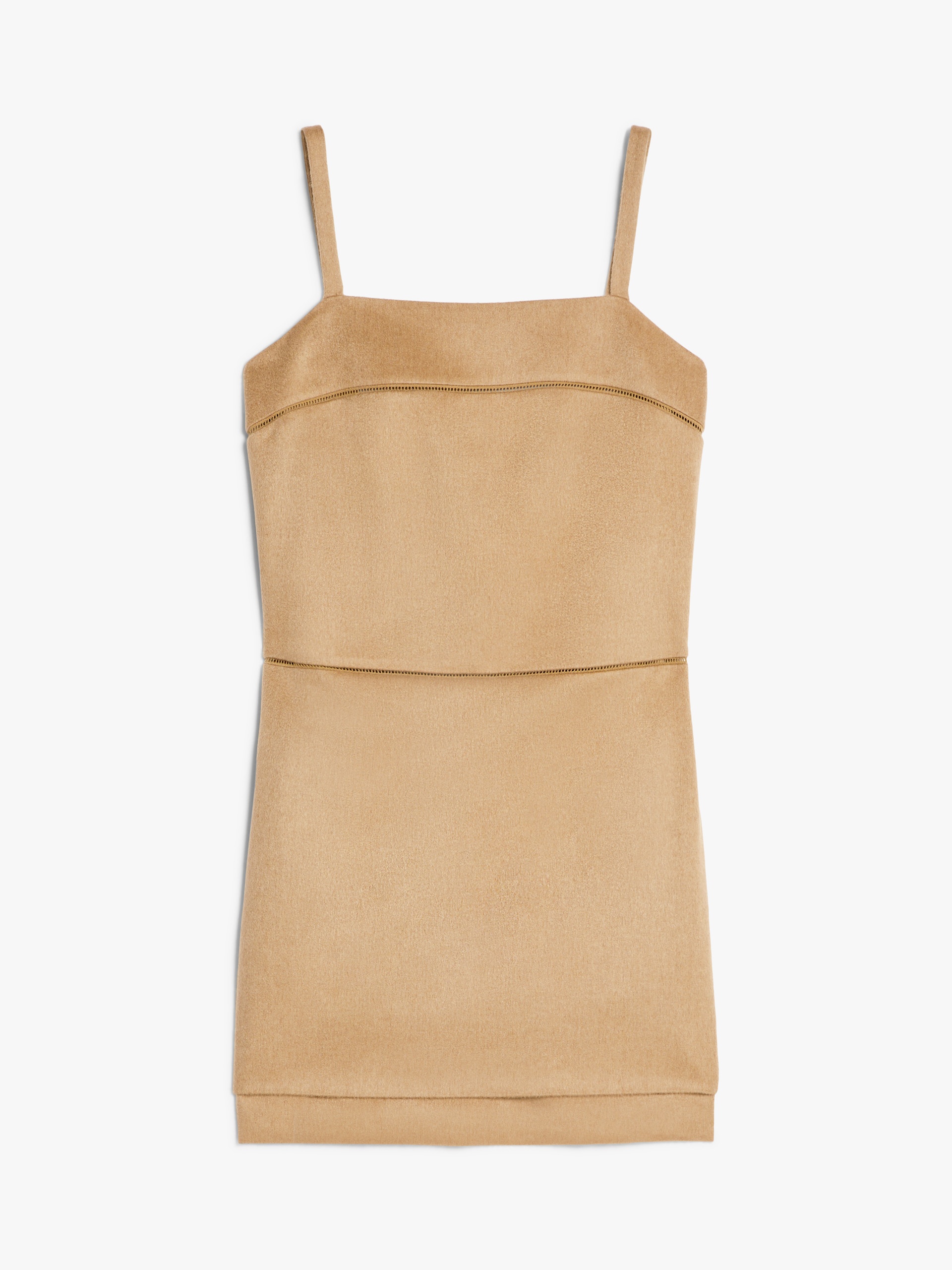 DETAILS Short sleeveless dress in luxurious pure camel hair drap. The style features a straight silhouette with a square neckline and fine straps. Includes in-set pockets on the sides, patch pockets on the back and an asymmetric hem with small side slits. Lined, with a back concealed zip fastening. COMPOSITION AND CARE Fabric 100% camelwool; lining 95% acetate, 5% elastane; embroidery thread 100% polyester. Do not wash; do not bleach; do not tumble dry; cool iron; professionally dry clean perchloroethylene - mild process; do not wet clean.; put this item into a string bag before washing it. Distributed by Max Mara S.r.l., registered office in Reggio Emilia (Italy), Via Giulia Maramotti 4, 42124 (IT)