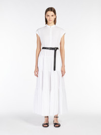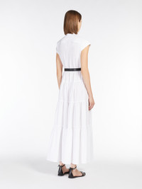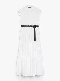DETAILS Long, soft pure cotton poplin sleeveless dress. Unlined style inspired by the shirt dress with a mandarin collar, cap sleeves with side inset pockets. The three flounces add volume, while the matching belt accentuates the waist. Concealed front fastening. COMPOSITION AND CARE Dress fabric 100% cotton; with belt in polyester with polyurethane coating. Dress: machine wash cold delicate cycle; do not bleach; do not tumble dry; line drying in the shade; cool iron; professionally dry clean perchloroethylene - mild process.; Wash the garment while it is fastened.; Do not iron the buttons.; Turn the articles inside out before washing.; Contains non-textile parts of animal origin. Belt: do not wash; do not bleach; do not tumble dry; do not iron; do not dry clean; do not wet clean. Distributed by Max Mara S.r.l., registered office in Reggio Emilia (Italy), Via Giulia Maramotti 4, 42124 (IT)