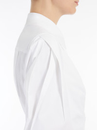 DETAILS Long shirt dress made of stretch cotton twill. Unlined, close-fitting garment with a classic shirt collar, long sleeves with a stitched pleat motif on the shoulder, wide cuffs and cufflink button. Wrap closure with asymmetrical pleats stitched at the waist on the left side, and sash fastened with snap buttons at the back. COMPOSITION AND CARE 97% cotton, 3% elastane. Hand wash cold; do not bleach; do not tumble dry; line drying in the shade; cool iron; professionally dry clean perchloroethylene - mild process; do not wet clean.; wash the garment while it is fastened.; turn the articles inside out before washing.; remove the cufflinks before washing.; contains non-textile parts of animal origin. Distributed by Max Mara S.r.l., registered office in Reggio Emilia (Italy), Via Giulia Maramotti 4, 42124 (IT)