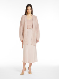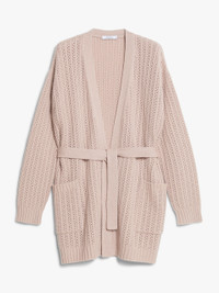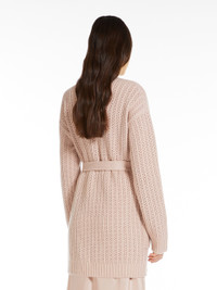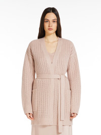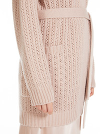 DETAILS Wrap cardigan made of luxurious wool and cashmere yarn in an openwork ribbed knit. Garment with slightly oversized volume, V-neck, long low set sleeves and patch pockets on the front. The wrap closure with a matching belt helps accentuate the waist. COMPOSITION AND CARE 70% wool, 30% cashmere. Hand wash cold; do not bleach; do not tumble dry; flat drying in the shade; cool iron; professionally dry clean perchloroethylene - mild process; do not wet clean.; iron with a cloth between.; using neutral detergent. Distributed by Max Mara S.r.l., registered office in Reggio Emilia (Italy), Via Giulia Maramotti 4, 42124 (IT)