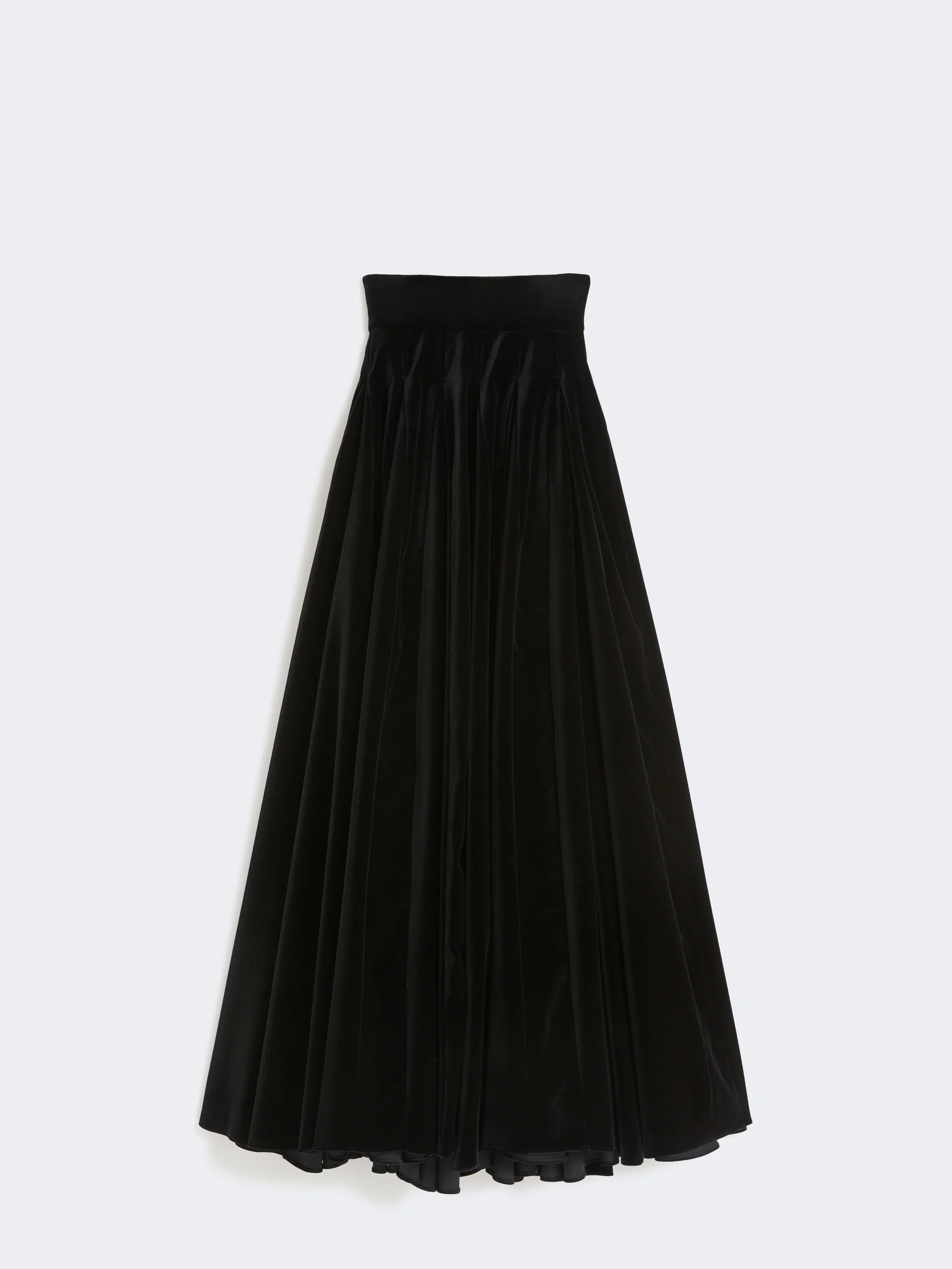 DETAILS Long high-waisted skirt, featuring inserts all around at hip level, which add volume and gentle movement. Stretch cotton velvet skirt with a sateen texture Wide lines, flared at the hem Wide waistband Back concealed zip fastening Side inset pockets Lined in stretch fabric COMPOSITION AND CARE Fabric 98% cotton, 2% elastane; lining 95% acetate, 5% elastane. Do not wash; do not bleach; do not tumble dry; cool iron; professionally dry clean perchloroethylene - mild process; do not wet clean. Distributed by Max Mara S.r.l., registered office in Reggio Emilia (Italy), Via Giulia Maramotti 4, 42124 (IT)