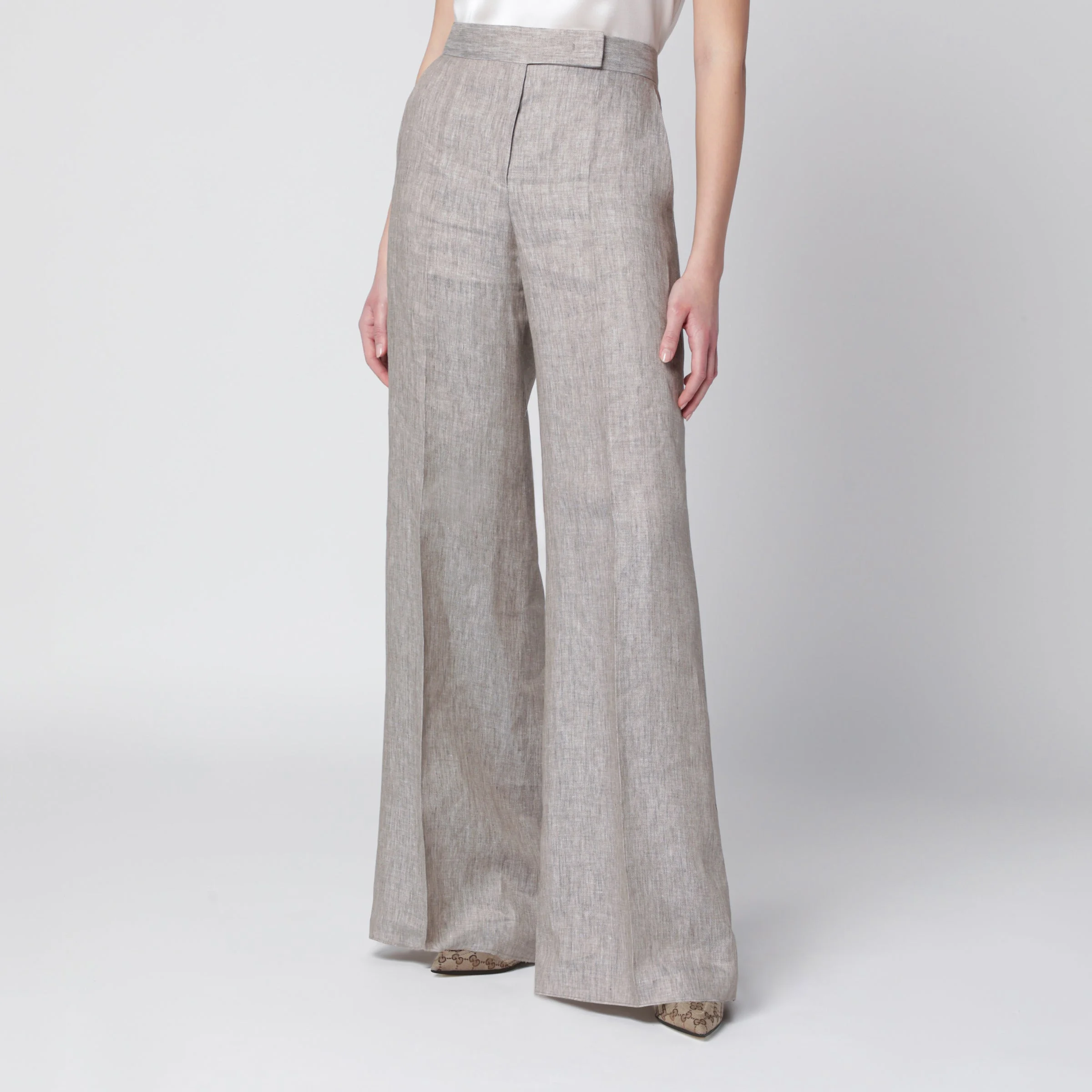 Trousers by Max Mara in chevron linen• Color: Beige• Wide leg• High waistband with zip fly and hook• French pockets on the sides• Pressed crease and darts sewn at the back waist