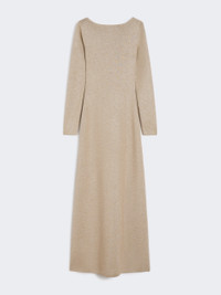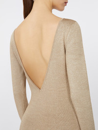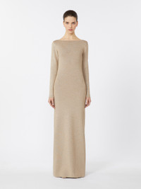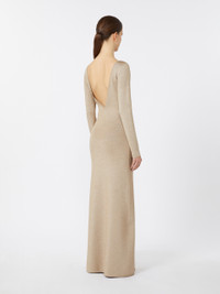 DETAILS Elegant long dress with a clinging, feminine silhouette. Dress in viscose and lurex yarn in a plain knit Plated knit with Lycra® Deep V-neck on the back Long set-in sleeves Unlined COMPOSITION AND CARE 67% viscose, 17% metallised fiber, 15% polyamide, 1% elastane. Do not wash; do not bleach; do not tumble dry; cool iron; professionally dry clean perchloroethylene - mild process; do not wet clean.; iron with a cloth between. Distributed by Max Mara S.r.l., registered office in Reggio Emilia (Italy), Via Giulia Maramotti 4, 42124 (IT)