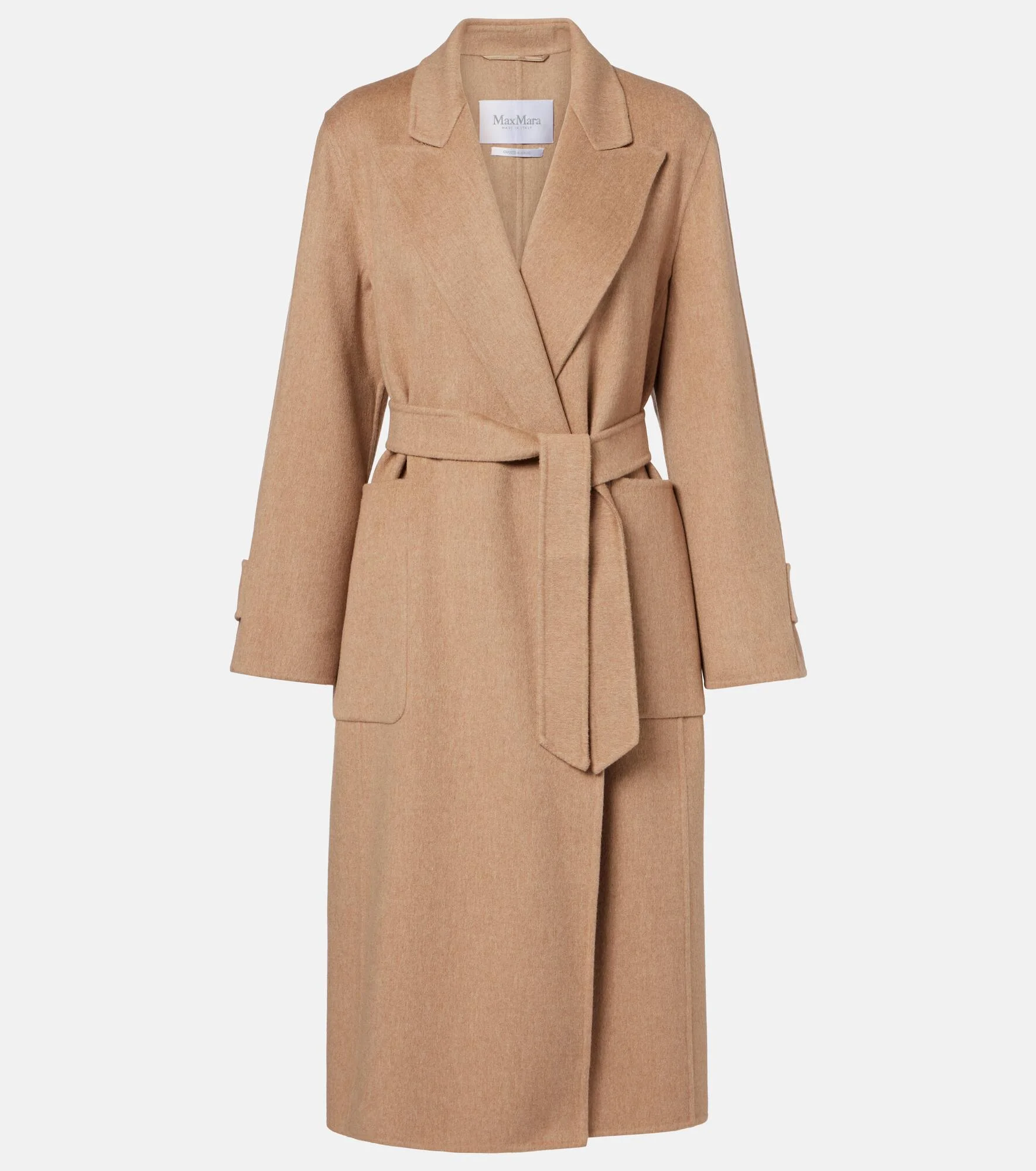 Boasting a rich manufacturing history, Max Mara represents the quintessence of Italian sophistication and expertise. This long coat is crafted from camel hair and cinched at the waist with an elegant detachable belt. Product Details - Material: 100% camel hair - Care instructions: dry clean - Made in Italy - Color: beige - Designer color name: Cuoio - Contains non-textile parts of animal origin - Peak lapel - Cuff: buttoned - Pockets: patch pockets - Detachable belt - Closure: belted waist - Item number: P01120684 Size & Fit - True to size - Loose fit, comes with belt - Non-stretchy fabric - The model seen in the picture is 178cm-5'10" and wearing a size DE 34