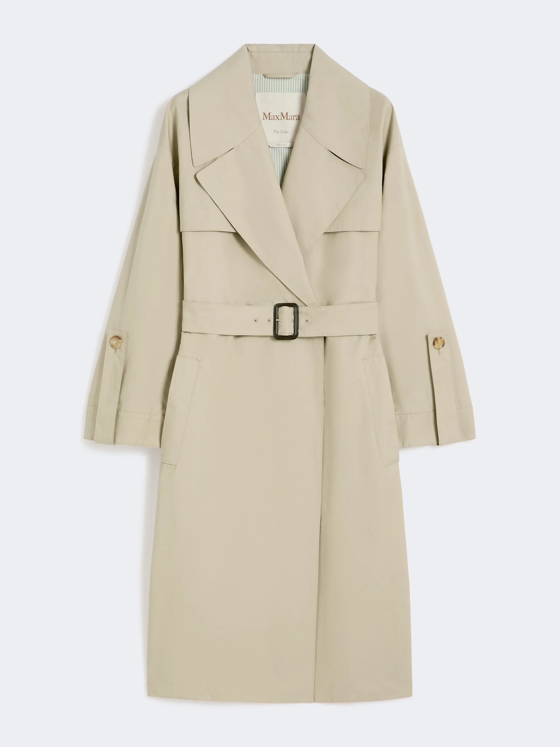 DETAILS Midi-length double-breasted trench coat with two detached yokes on the front, tailored stitching and welt side pockets. - The main fabric contains at least 50% cotton fibre grown in accordance with organic farming principles. - Trench coat in water-repellent cotton-blend twill - Straight line with central slit and cape on the back - Wide lapel collar with embroidered logo on the undercollar - Set-in sleeves and roll-up cuffs with adjustable straps - Horn button fastening and a matching belt - Half-lined in taffeta fabric and branded jacquard ribbon COMPOSITION AND CARE Fabric 69% cotton, 31% polyester; lining 100% polyester; - exclusive of embroideries. Machine wash cold delicate cycle; do not bleach; do not tumble dry; line drying in the shade; cool iron; professionally dry clean perchloroethylene - mild process.; wash the garment while it is fastened.; don’t iron the labels.; do not iron the buttons.; protect buttons before washing.; turn the articles inside out before washing.; remove the buckle before washing.; contains non-textile parts of animal origin. Distributed by Max Mara S.r.l., registered office in Reggio Emilia (Italy), Via Giulia Maramotti 4, 42124 (IT) Collection: Max Mara The Cube Product code: 9021066406013 - MTCAMOUR