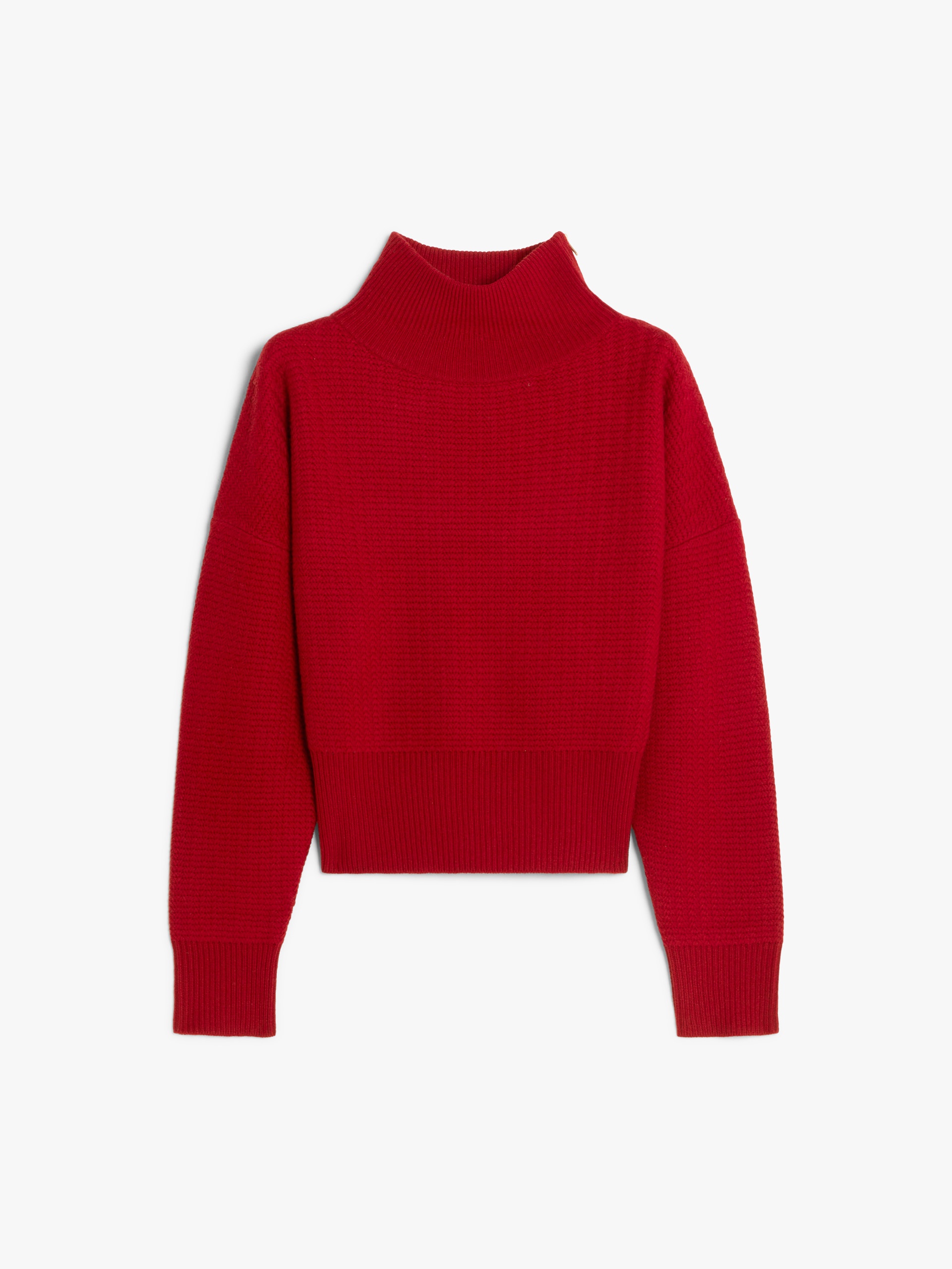 DETAILS High-neck sweater in 5-gauge woven-knit wool and cashmere yarn; dropped shoulders, relaxed fit and rib-knit band detail at the hem. Fixed metal zip on the left shoulder, complete with a Max Mara-branded classic pull-tab. COMPOSITION AND CARE 70% wool, 30% cashmere. Hand wash cold; do not bleach; do not tumble dry; flat drying in the shade; cool iron; professionally dry clean perchloroethylene - mild process; do not wet clean.; iron with a cloth between.; using neutral detergent. Distributed by Max Mara S.r.l., registered office in Reggio Emilia (Italy), Via Giulia Maramotti 4, 42124 (IT)