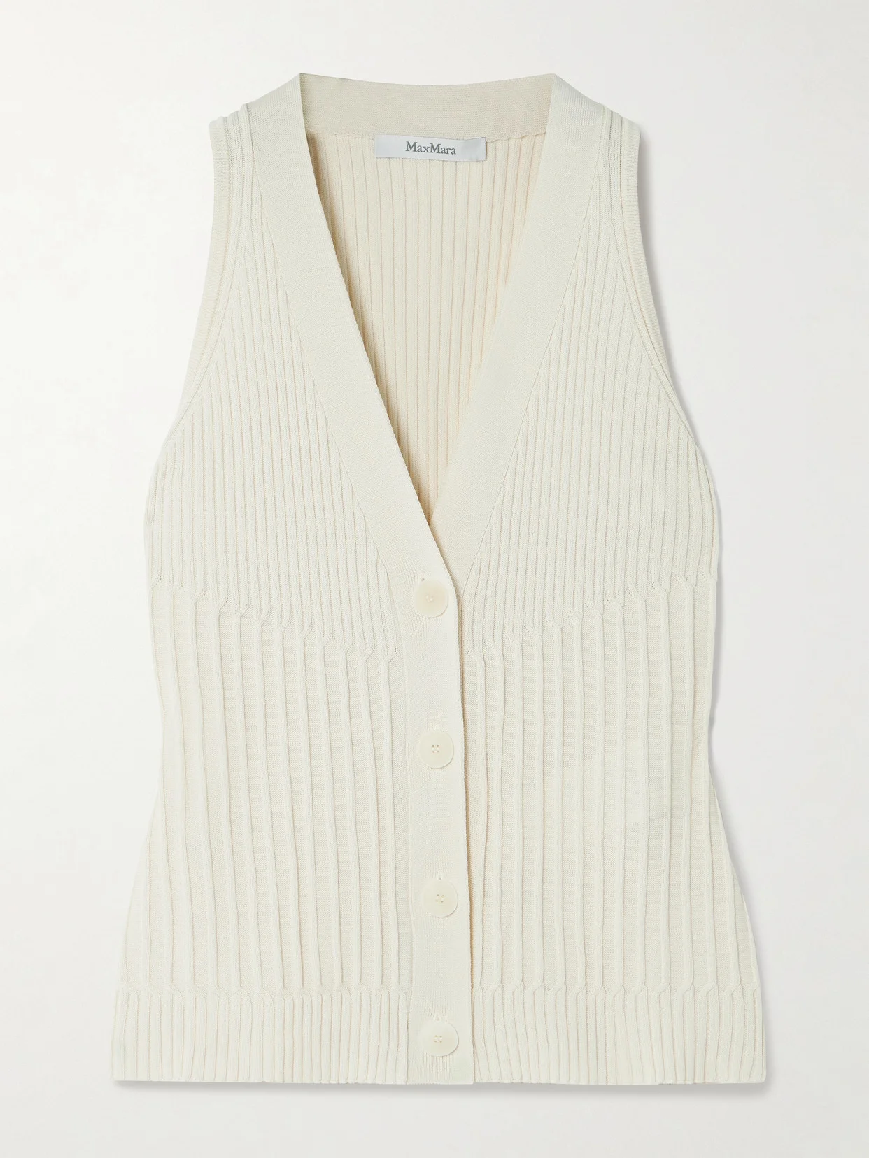 Max Mara's 'Bimba' vest blends the look of classic tailoring with the comfort of your favorite sweater. Knitted from soft cotton-blend using a neat ribbed stitch, it has a close fit and deep V-neckline. Wear yours with tonal pants and stacks of bracelets.
