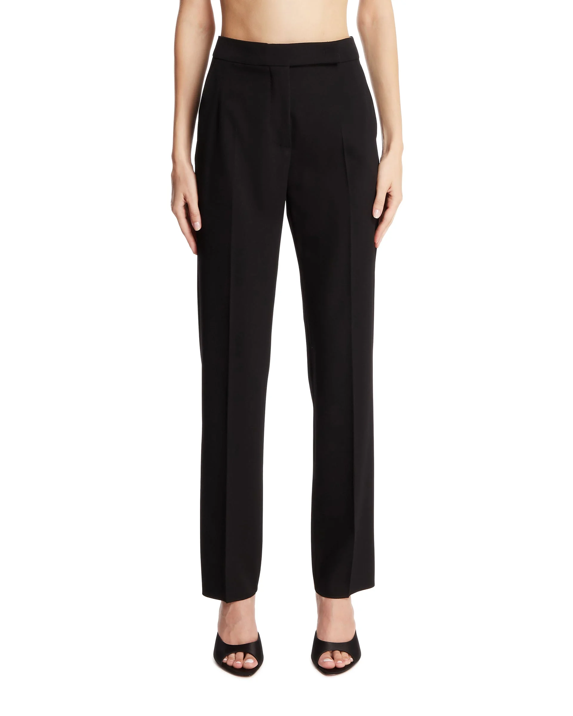 Max Mara Black Slim-Fit Trousers. Black virgin wool blend, hidden front closure, pressed creases, French-style side pockets, two buttoned back pockets, slim-fit leg, straight hem. Daniele is 178 cm and she is wearing size 40. DETAILS Model: 2521136191600001 Composition: 100% Virgin Wool, 2% Elastane Made in: ITALY Season: FW25-26