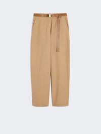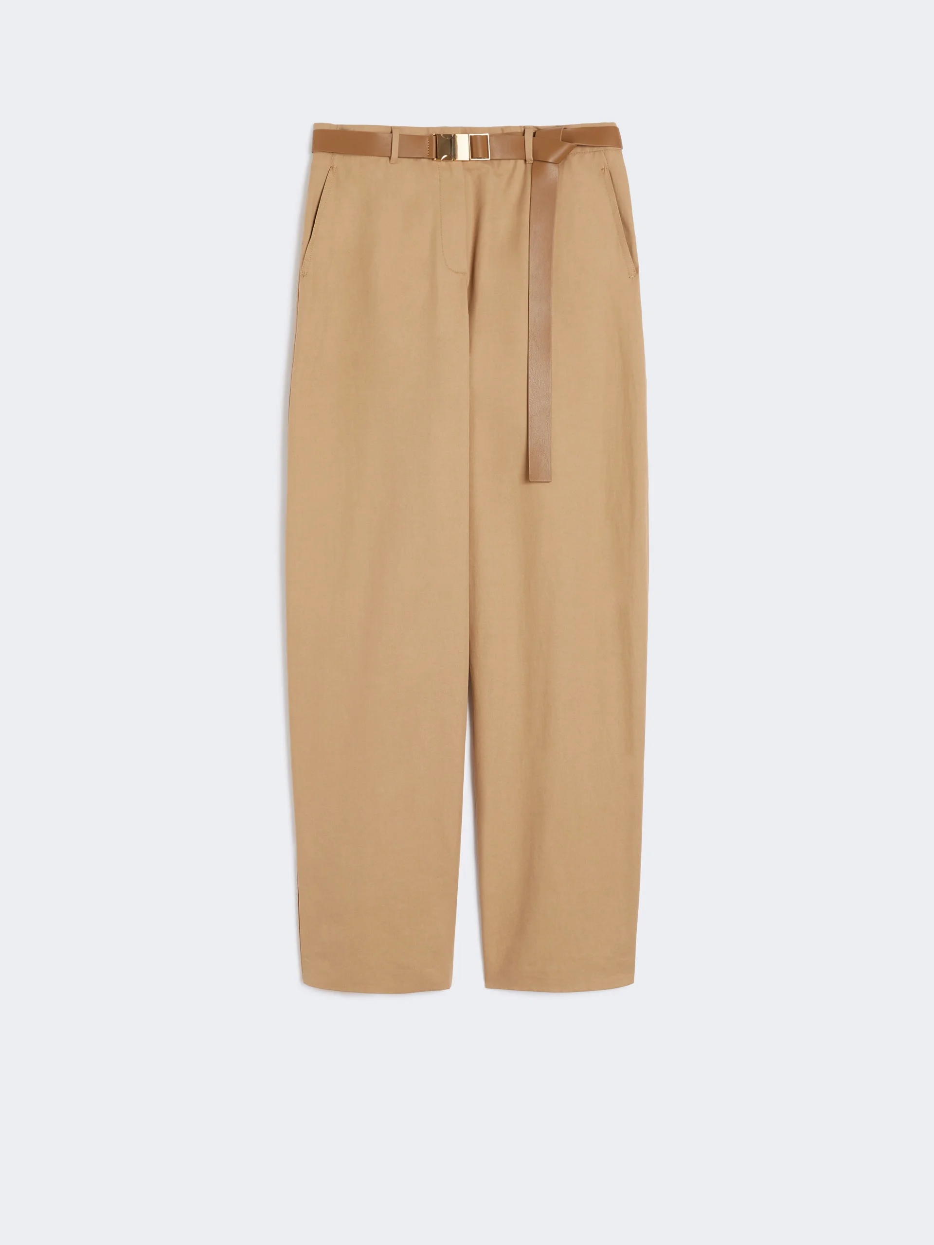DETAILS Trousers with wide legs slightly tapered to the hem. Pure cotton Batavia trousers Fastening with high waistband tab, zip fly and small hook Slant pockets at the sides Patch pockets at the back Matching belt in coated fabric with metal buckle COMPOSITION AND CARE Trousers fabric 100% cotton; with belt in polyester with polyurethane coating. Trousers: machine wash cold delicate cycle; do not bleach; do not tumble dry; line drying in the shade; cool iron; professionally dry clean perchloroethylene - mild process. Belt: do not wash; do not bleach; do not tumble dry; do not iron; do not dry clean; do not wet clean. Distributed by Max Mara S.r.l., registered office in Reggio Emilia (Italy), Via Giulia Maramotti 4, 42124 (IT)