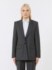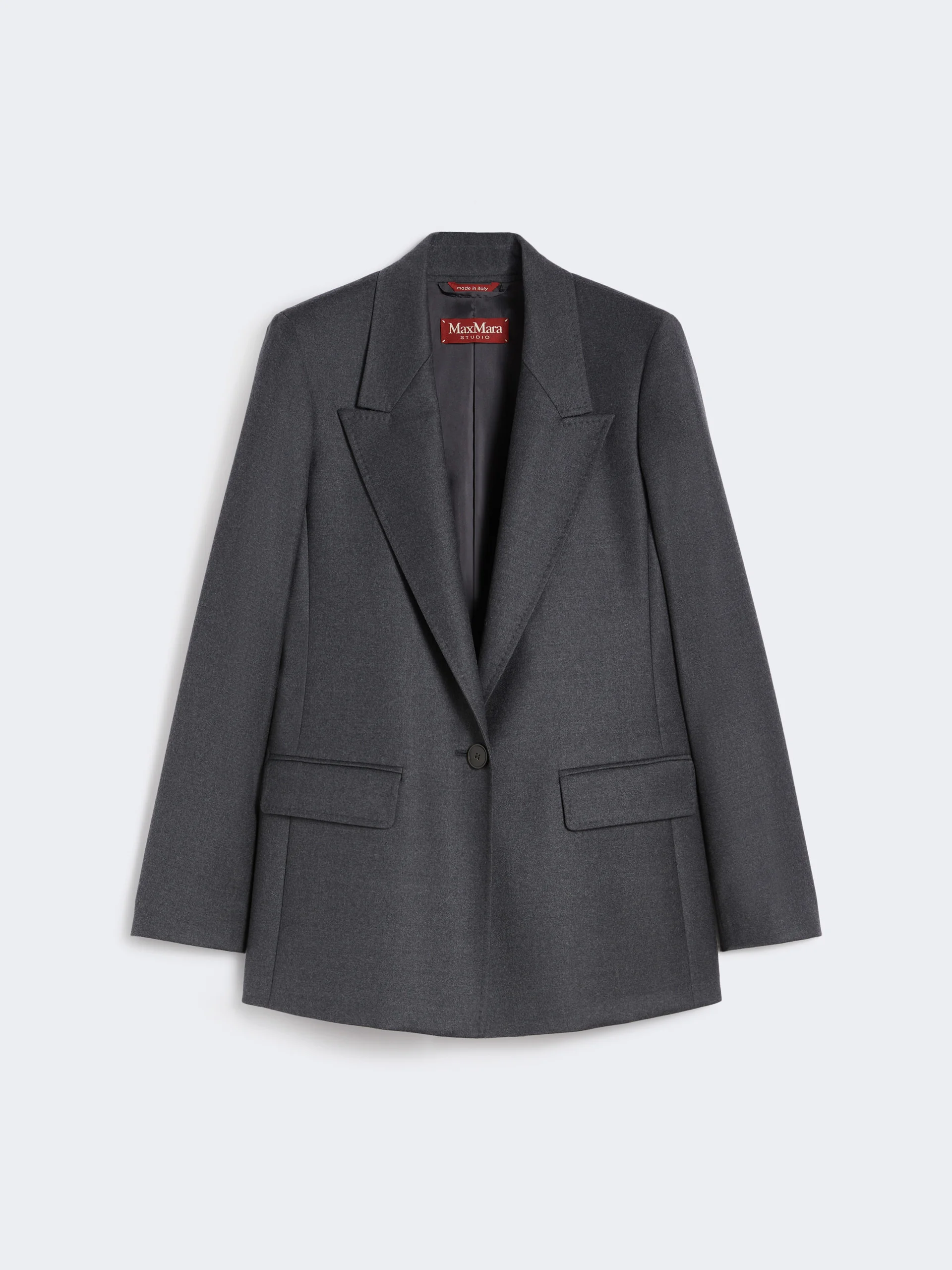 DETAILS Mannish single-breasted blazer with tailoring-style hand-stitched detail. Stretch wool flannel blazer Regular fit with a central rear slit Classic lapel collar Set-in sleeves with buttoned hem detail Single-button front fastening Flap front pockets Lined model COMPOSITION AND CARE Fabric 99% virgin wool, 1% elastane; lining 70% acetate, 30% polyester. Do not wash; do not bleach; do not tumble dry; cool iron; professionally dry clean perchloroethylene - mild process; do not wet clean.; do not iron the buttons.; protect buttons before washing.; contains non-textile parts of animal origin. Distributed by Max Mara S.r.l., registered office in Reggio Emilia (Italy), Via Giulia Maramotti 4, 42124 (IT)