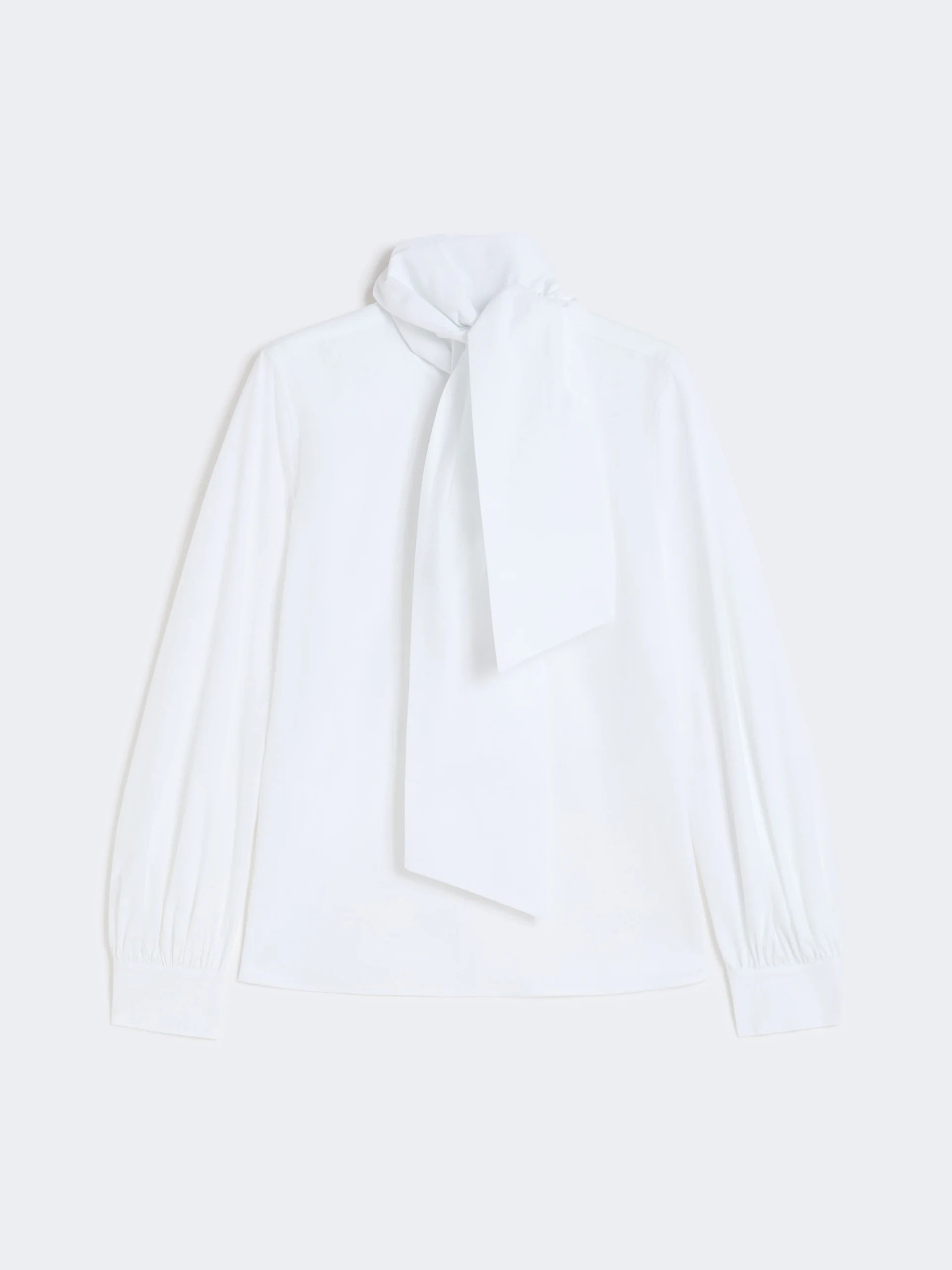 DETAILS Feminine blouse with straight lines, distinguished by long puff sleeves. Stretch cotton poplin blouse V-neck and foulard collar that ties in a bow Deep cuffs with covered side button Removable metallic jewel loop Back yoke cut Rounded hem with small side slits COMPOSITION AND CARE 97% cotton, 3% elastane. Machine wash cold delicate cycle; do not bleach; do not tumble dry; line drying in the shade; cool iron; professionally dry clean perchloroethylene - mild process.; wash the garment while it is fastened.; do not iron the buttons.; protect buttons before washing.; turn the articles inside out before washing. Distributed by Max Mara S.r.l., registered office in Reggio Emilia (Italy), Via Giulia Maramotti 4, 42124 (IT)