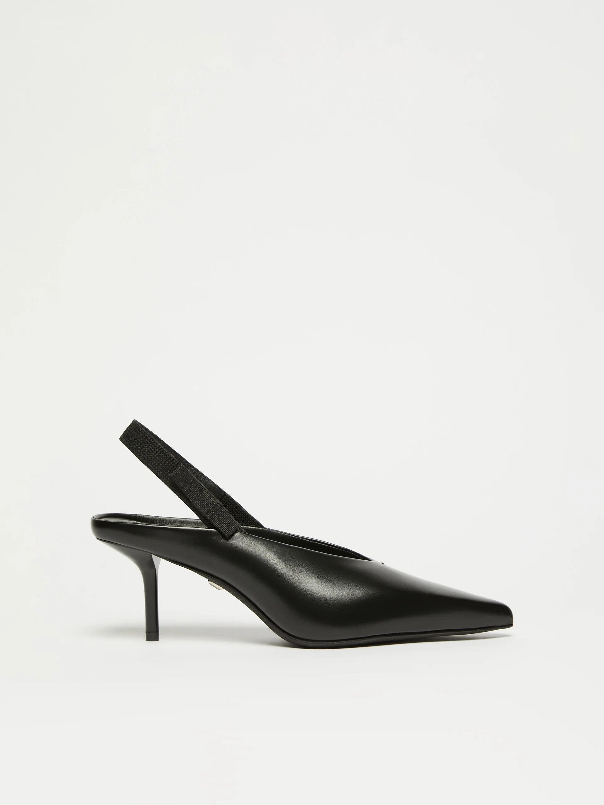 DETAILS Tapered mules with V top line, square back and tonal lacquered kitten heel. Smooth low-sheen calfskin mules Nappa leather lining and customised label in the insole Elastic slingback strap with Max Mara logo and couture bow Stiletto heel, in an ergonomic position for greater stability Max Mara square logo detail in the hollow of the foot Pumice leather sole with rubber toe Heel height: 6.5 cm COMPOSITION AND CARE Upper in calf; lining in lamb leather; sole in leather. Distributed by Max Mara S.r.l., registered office in Reggio Emilia (Italy), Via Giulia Maramotti 4, 42124 (IT)