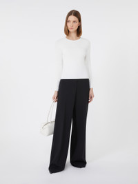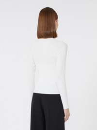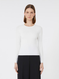 DETAILS Sweater featuring a silhouette-accentuating rib-knit pattern. Stretch technical viscose yarn sweater Slim fit Crew neckline Long raglan sleeves COMPOSITION AND CARE 83% viscose, 17% polyester. Hand wash cold (40°c max); do not bleach; do not tumble dry; flat drying in the shade; cool iron; professionally dry clean perchloroethylene - mild process; do not wet clean.; iron with a cloth between.; using neutral detergent. Distributed by Max Mara S.r.l., registered office in Reggio Emilia (Italy), Via Giulia Maramotti 4, 42124 (IT)