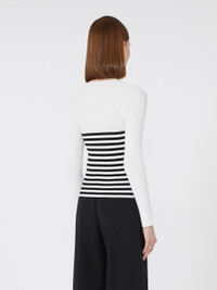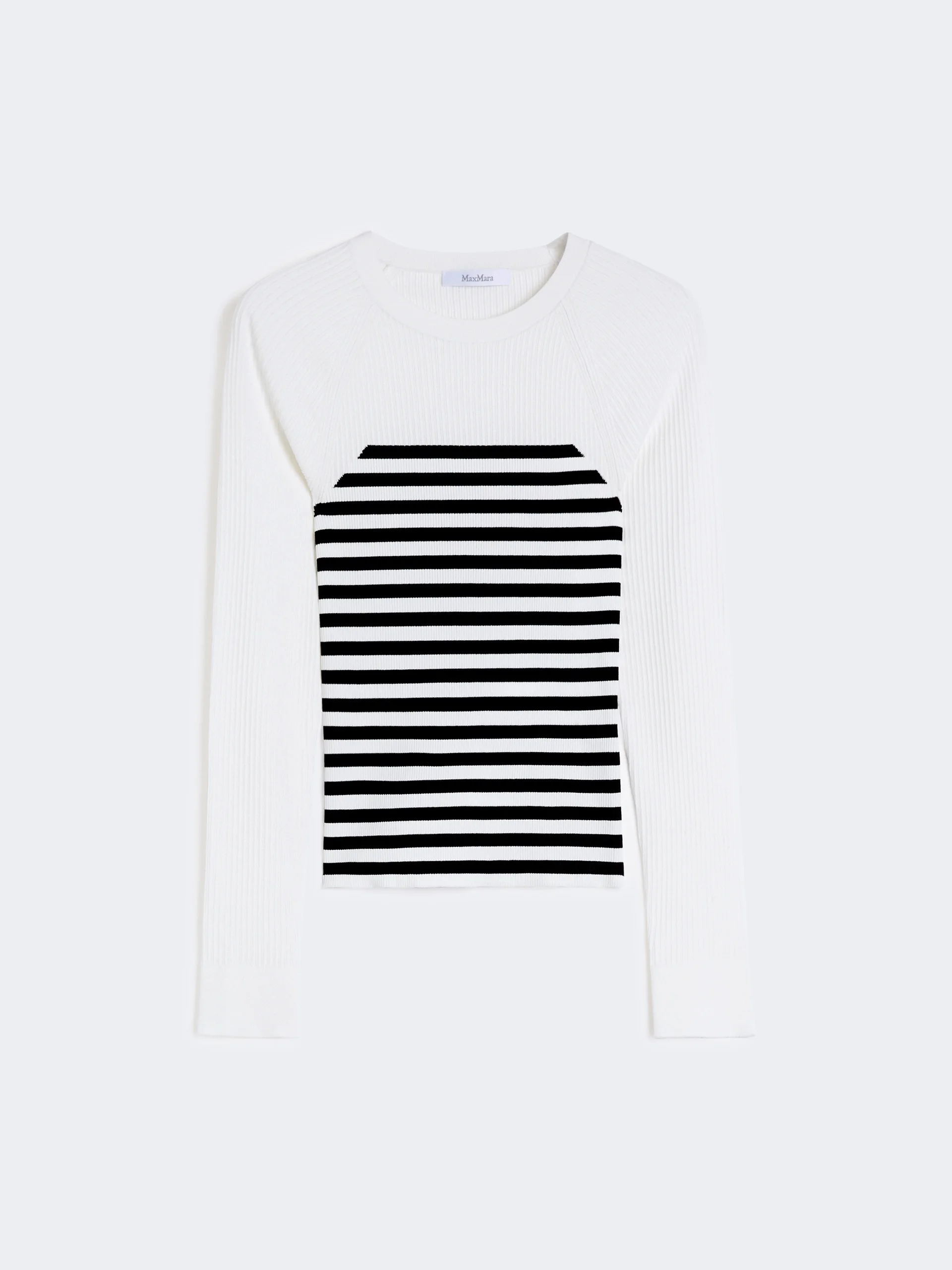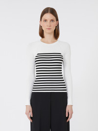 DETAILS Sweater featuring a silhouette-accentuating rib-knit pattern. Stretch technical viscose yarn sweater Slim fit Crew neckline Long raglan sleeves COMPOSITION AND CARE 83% viscose, 17% polyester. Hand wash cold; do not bleach; do not tumble dry; flat drying in the shade; cool iron; professionally dry clean perchloroethylene - mild process; do not wet clean.; iron with a cloth between.; using neutral detergent. Distributed by Max Mara S.r.l., registered office in Reggio Emilia (Italy), Via Giulia Maramotti 4, 42124 (IT)