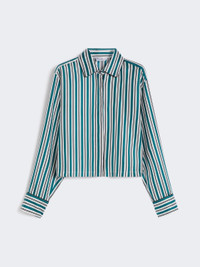 DETAILS Straight-cut shirt with boxy fit, cropped to the waist. - Silk twill shirt with striped print - Pointed collar - Long sleeves with slightly dropped shoulders - Concealed button fastening at the front - Cuffs with geometric button - Contrasting piping motif on cuffs and collar COMPOSITION AND CARE Fabric 100% silk; - exclusive of decoration. Do not wash; do not bleach; do not tumble dry; cool iron; professionally dry clean perchloroethylene - mild process; do not wet clean.; wash the garment while it is fastened.; do not iron the buttons.; protect buttons before washing.; turn the articles inside out before washing. Distributed by Max Mara S.r.l., registered office in Reggio Emilia (Italy), Via Giulia Maramotti 4, 42124 (IT)