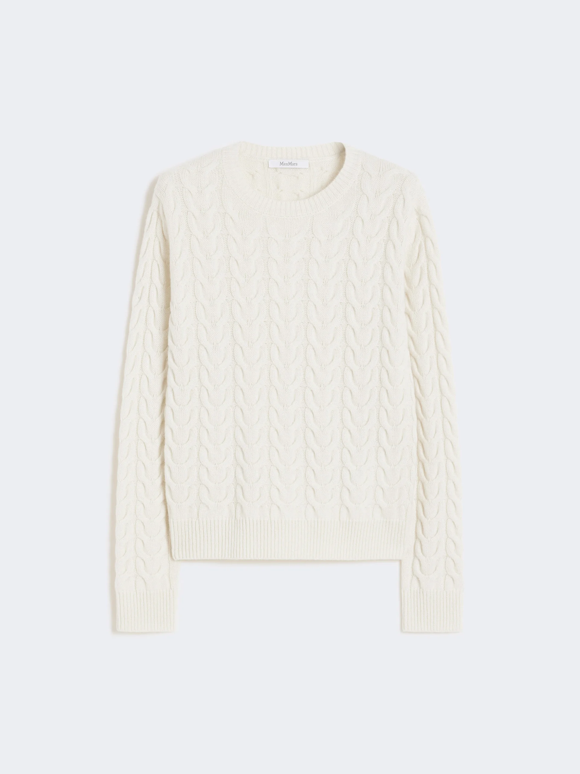 DETAILS Basic small-volume pullover with all-over cable pattern. Pure cashmere yarn pullover Semi-fitted Crew neck Long set-in sleeves Straight hem Ribbed edges COMPOSITION AND CARE 100% cashmere. Hand wash cold (40°c max); do not bleach; do not tumble dry; flat drying in the shade; cool iron; professionally dry clean perchloroethylene - mild process; do not wet clean.; iron with a cloth between.; using neutral detergent. Distributed by Max Mara S.r.l., registered office in Reggio Emilia (Italy), Via Giulia Maramotti 4, 42124 (IT)