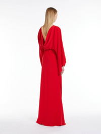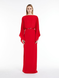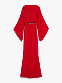 DETAILS Long cady dress featuring a feminine silhouette with a boat neckline on the front, wide kimono sleeves and a deep V neck on the back. The patent-effect belt defines the waist. Length: 150 cm. COMPOSITION AND CARE Dress fabric 73% triacetate, 27% polyester; lining 85% acetate, 10% silk, 5% polyamide; with belt in 100% polyester; with belt in with polyurethane coating. Dress: do not wash; do not bleach; do not tumble dry; cool iron; professionally dry clean perchloroethylene - mild process; do not wet clean. Belt: do not wash; do not bleach; do not tumble dry; do not iron; do not dry clean; do not wet clean. Distributed by Max Mara S.r.l., registered office in Reggio Emilia (Italy), Via Giulia Maramotti 4, 42124 (IT)