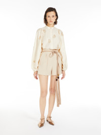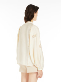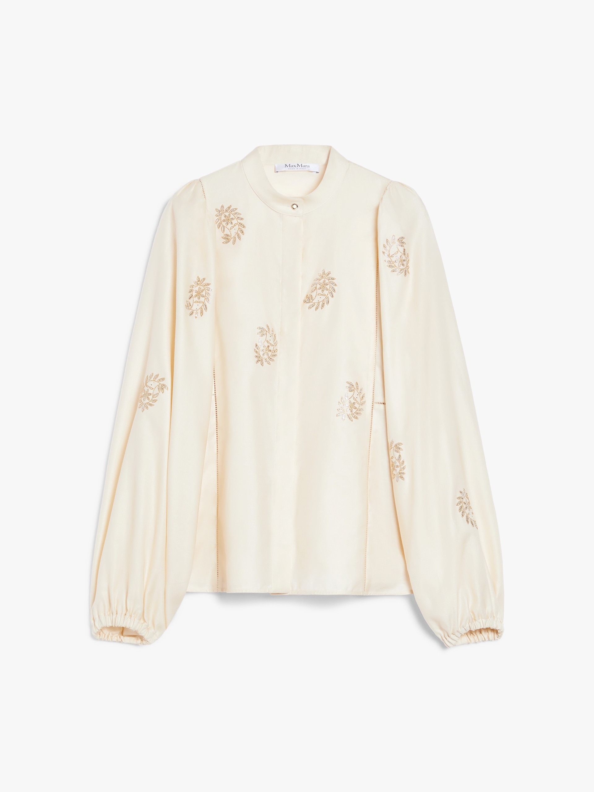 DETAILS Shirt made of lightweight pure cotton satin. The placement embroideries on the front and sleeves create a dynamic effect thanks to their different direction, while the inlaid trimming details embellish the garment on the front and back. The garment features a mandarin collar and long, wide balloon sleeves with elastic cuff and gathered shoulder. Featuring small rounded slits at the hem. Concealed button fastening at the front. COMPOSITION AND CARE Fabric 100% cotton; - exclusive of decoration. Machine wash cold delicate cycle; do not bleach; do not tumble dry; line drying in the shade; cool iron; professionally dry clean perchloroethylene - mild process.; put this item into a string bag before washing it.; wash the garment while it is fastened.; do not iron the buttons.; do not iron the decoration.; protect buttons before washing.; turn the articles inside out before washing. Distributed by Max Mara S.r.l., registered office in Reggio Emilia (Italy), Via Giulia Maramotti 4, 42124 (IT)
