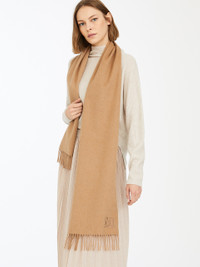 DETAILS Classic Max Mara scarf made of exquisite pure camel fabric, finished with M monogram embroidered logo and sartorial-inspired pick stitch motif. Dimensions: 28 x 206 cm COMPOSITION AND CARE 100% camelwool. Do not wash; do not bleach; do not tumble dry; cool iron; professionally dry clean perchloroethylene - mild process; do not wet clean.; to be ironed on reverse.; to be ironed with no steam.; iron with a cloth between. Distributed by Max Mara S.r.l., registered office in Reggio Emilia (Italy), Via Giulia Maramotti 4, 42124 (IT)