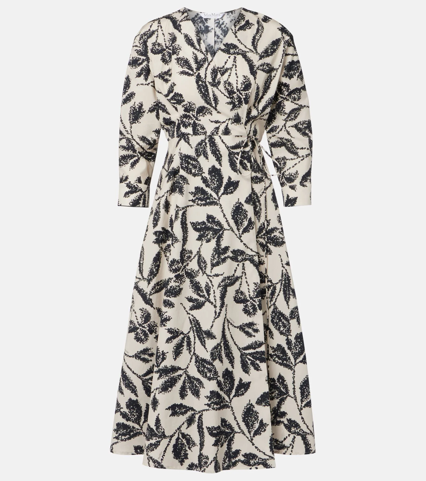 Boasting a rich manufacturing history, Max Mara represents the quintessence of Italian sophistication and expertise. The Camino cotton wrap dress is tailored to a midi silhouette and finished with an all-over foliage print. Product Details - Material: 100% cotton - Care instructions: machine wash at 30 degrees - Made in Italy - Color: white - Designer color name: Lino/Nero - Closure: self-ties - Attached belt - Collar: V-neck - Item number: P01149949 Size & Fit - True to size - Cinched waist - Adjustable at the waist - Non-stretchy fabric - The model seen in the picture is 178cm-5'10" and wearing a size DE 34