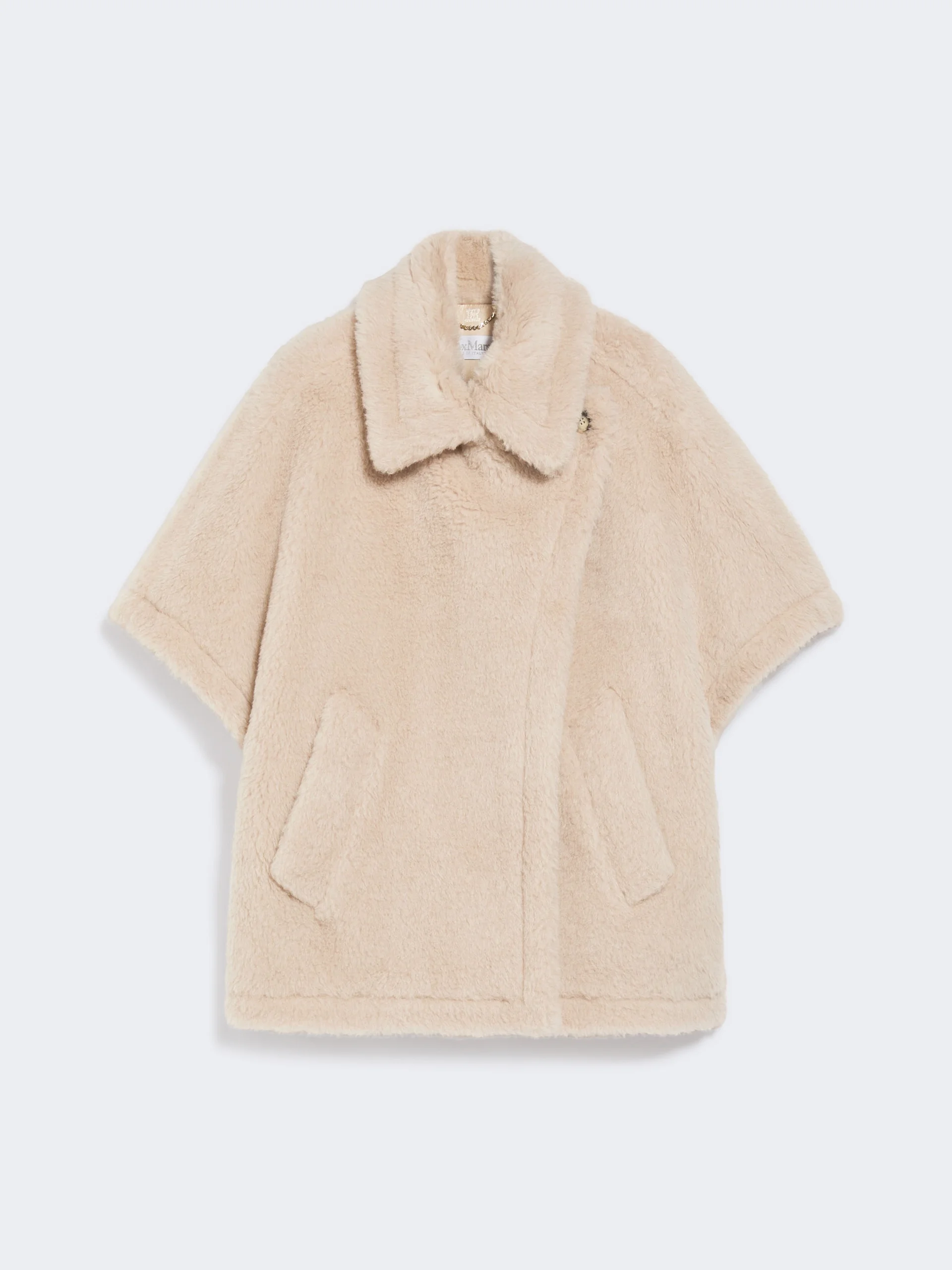DETAILS Short cape featuring an enveloping fit and side slits. - Cape in alpaca and wool Teddy fabric, set on a silk base - The 2-in-1 collar can either be worn open with the lapels visible or buttoned up - Short kimono sleeves - Asymmetrical button fastening - Diagonal-welt pockets at the sides - Viscose lining COMPOSITION AND CARE Jersey fabric 62% alpaca, 26% virgin wool, 12% silk; lining 100% viscose. Do not wash; do not bleach; do not tumble dry; do not iron; professionally dry clean perchloroethylene - mild process; do not wet clean. Distributed by Max Mara S.r.l., registered office in Reggio Emilia (Italy), Via Giulia Maramotti 4, 42124 (IT) Collection: MaxMara Accessori Product code: 4736176206002 - TEBE1