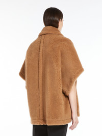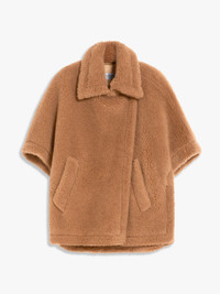 DETAILS Short cape featuring an enveloping fit and side slits. Cape in camel Teddy fabric, set on a silk base The 2-in-1 collar can either be worn open with the lapels visible or buttoned up Short kimono sleeves Asymmetrical button fastening Diagonal-welt pockets at the sides Viscose lining COMPOSITION AND CARE Jersey fabric 88% camelwool, 12% silk; lining 100% viscose. Do not wash; do not bleach; do not tumble dry; do not iron; professionally dry clean perchloroethylene - mild process; do not wet clean. Distributed by Max Mara S.r.l., registered office in Reggio Emilia (Italy), Via Giulia Maramotti 4, 42124 (IT)