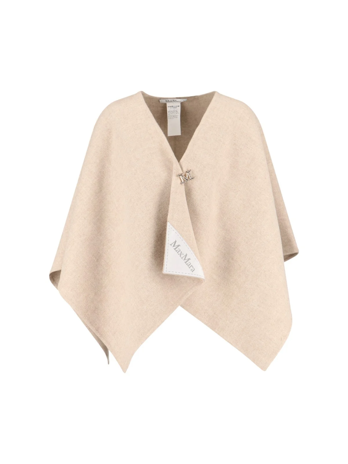 MAX MARA 'SERRA' CAPE IN ALPACA AND CREAM WOOL BLEND, V-NECK, GOLD METAL LOGO CHARM CLOSURE, SILVER CRYSTAL RHINESTONE DETAILS, FRONT LOGO PATCH, ASYMMETRICAL HEM. PRODUCT INFO PRODUCT CODE 2524546081600002 COMPOSITION: 55% ALPACA, 25% POLYAMIDE, 20% WOOL SIZE AND FIT: SOFT FIT MADE IN: PERU - DETAILS: 100% CRYSTAL