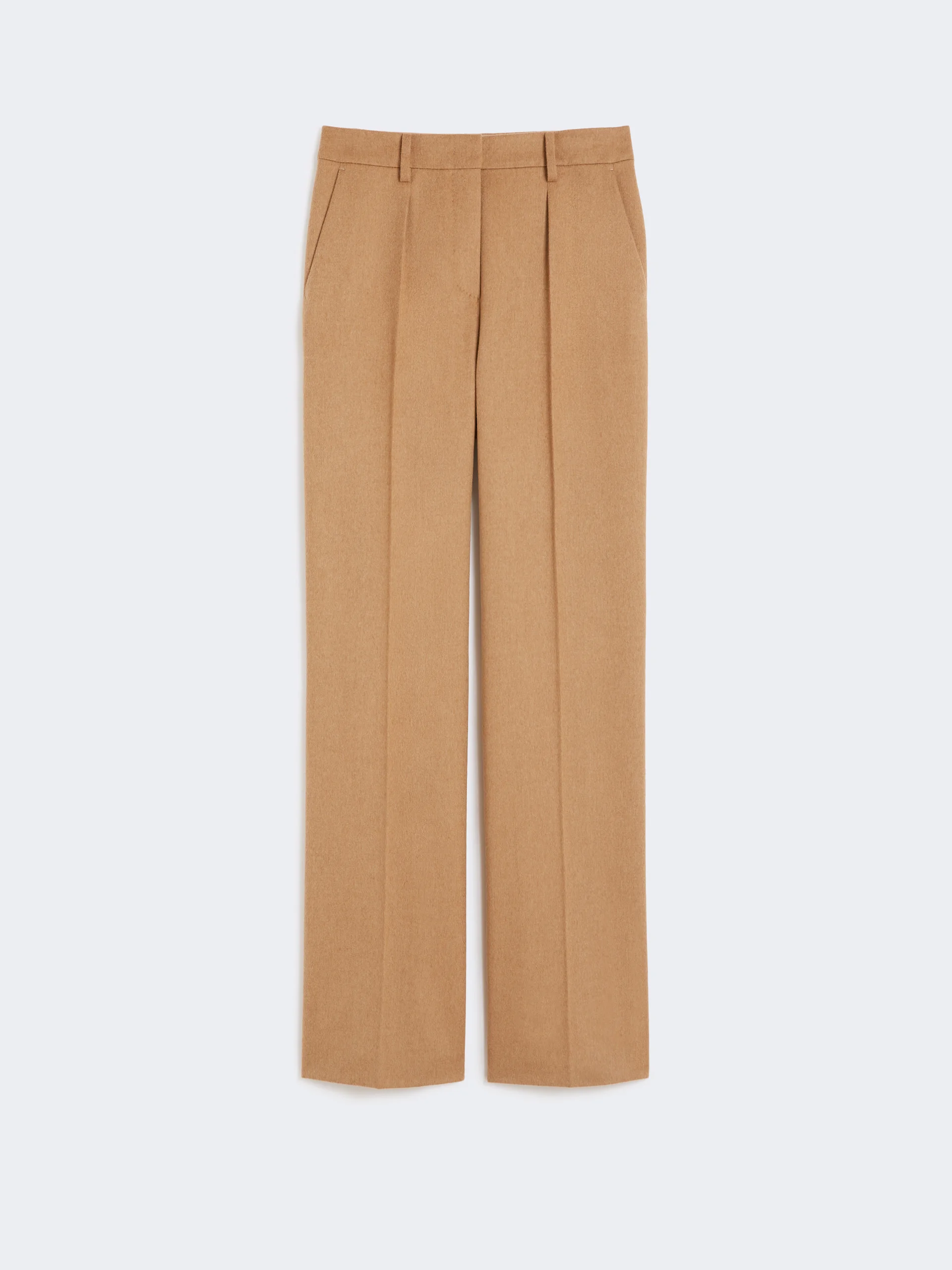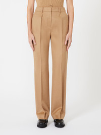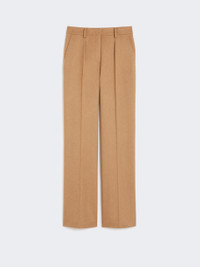 DETAILS Straight-leg trousers with tailored construction. Lightweight pure zibeline camel drap trousers Straight line with pleats on the front Fastening with a wide waistband tab, zip fly and small hook Slant pockets at the sides Welt pockets at the back Belt loops and trouser crease COMPOSITION AND CARE 100% camelwool. Do not wash; do not bleach; do not tumble dry; cool iron; professionally dry clean perchloroethylene - mild process; do not wet clean.; protect buttons before washing. Distributed by Max Mara S.r.l., registered office in Reggio Emilia (Italy), Via Giulia Maramotti 4, 42124 (IT)