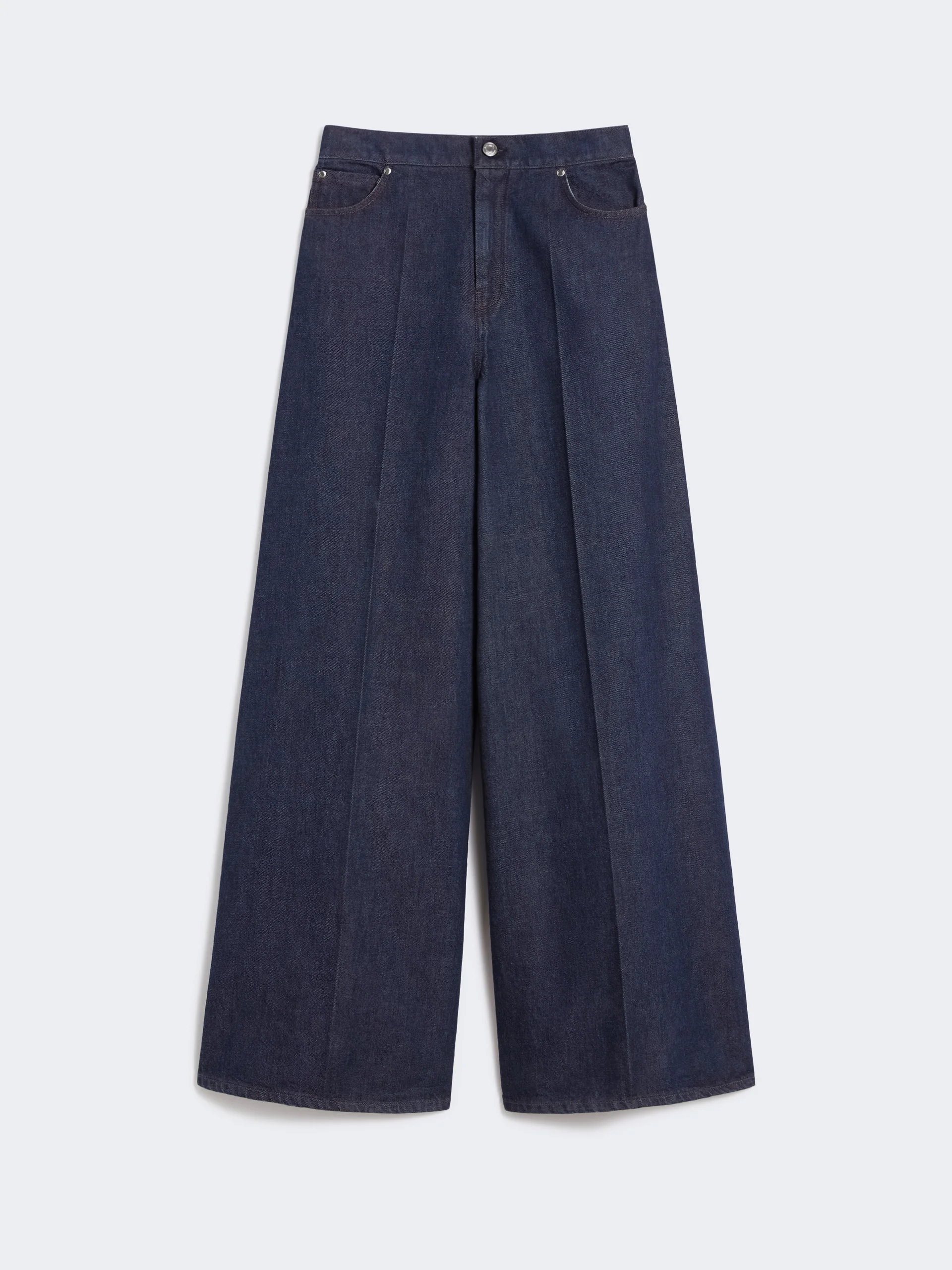 DETAILS Five-pocket, wide-leg jeans, customised with leather logo label on the waist back and M-shaped stitching on the back pockets. Pure cotton denim jeans Wide leg Concealed zip and tack button fastening Patch pockets on the back Contrasting stitching Metal rivets and trouser crease COMPOSITION AND CARE 100% cotton. Machine wash cold delicate cycle; do not bleach; do not tumble dry; line drying in the shade; cool iron; professionally dry clean perchloroethylene - mild process.; wash the garment while it is fastened.; don’t iron the labels.; do not iron the buttons.; protect buttons before washing.; turn the articles inside out before washing.; contains non-textile parts of animal origin. Distributed by Max Mara S.r.l., registered office in Reggio Emilia (Italy), Via Giulia Maramotti 4, 42124 (IT)