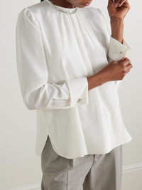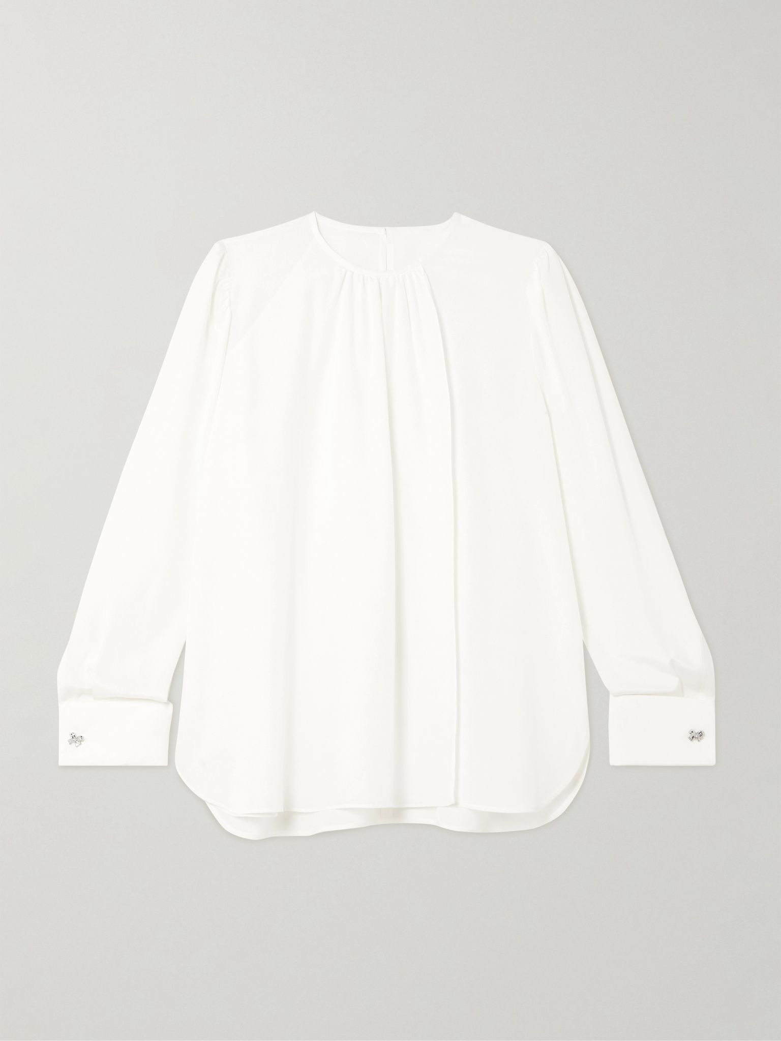 Encyclopaedic textile know-how sets Max Mara's clothing apart. This 'Carol' blouse is cut from fluid silk and gathered at the round neckline, so it falls beautifully through the front. We love the tiny bow-shaped buttons at the cuffs. Size & Fit - Fits true to size, take your normal size - Cut for a slightly loose fit - Mid-weight, fluid, non-stretchy fabric - Model is 180cm/ 5'11" and is wearing a UK 8 Model measurements: - Bust: 80cm/ 31.5" - Waist: 65cm/ 25.5" - Hip: 89cm/ 35" Details & Care - White silk - Button-fastening keyhole at back - 100% silk - Dry clean