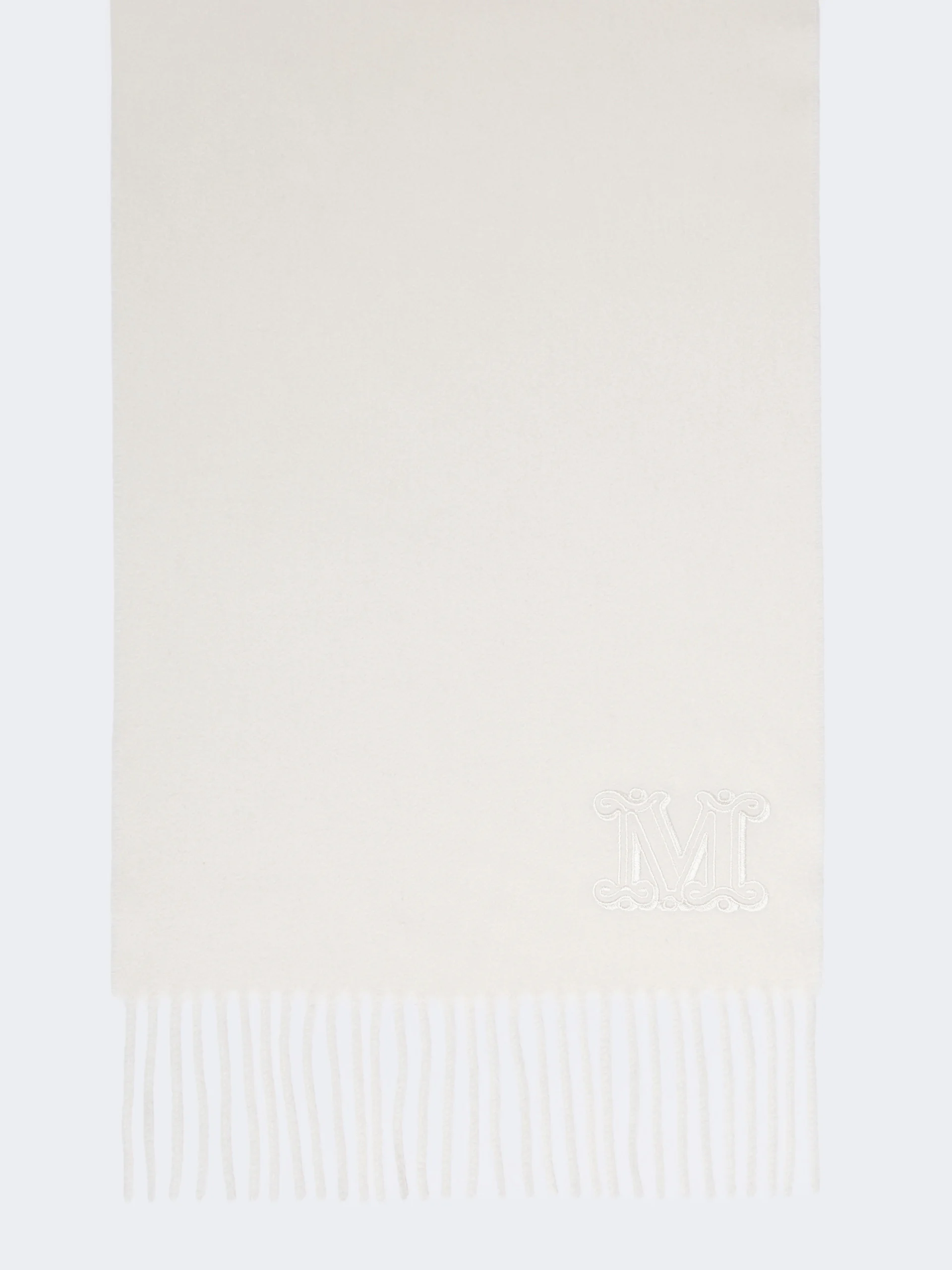DETAILS Stole with minimalist design, embellished with elegant, tonal embroidered M Monogram detail at the bottom. Stole in sable-look pure cashmere yarn Fringed shorter sides Size: 28 x 206 cm COMPOSITION AND CARE 100% cashmere. Do not wash; do not bleach; do not tumble dry; cool iron; professionally dry clean perchloroethylene - mild process; do not wet clean.; to be ironed on reverse.; to be ironed with no steam.; iron with a cloth between. Distributed by Max Mara S.r.l., registered office in Reggio Emilia (Italy), Via Giulia Maramotti 4, 42124 (IT)