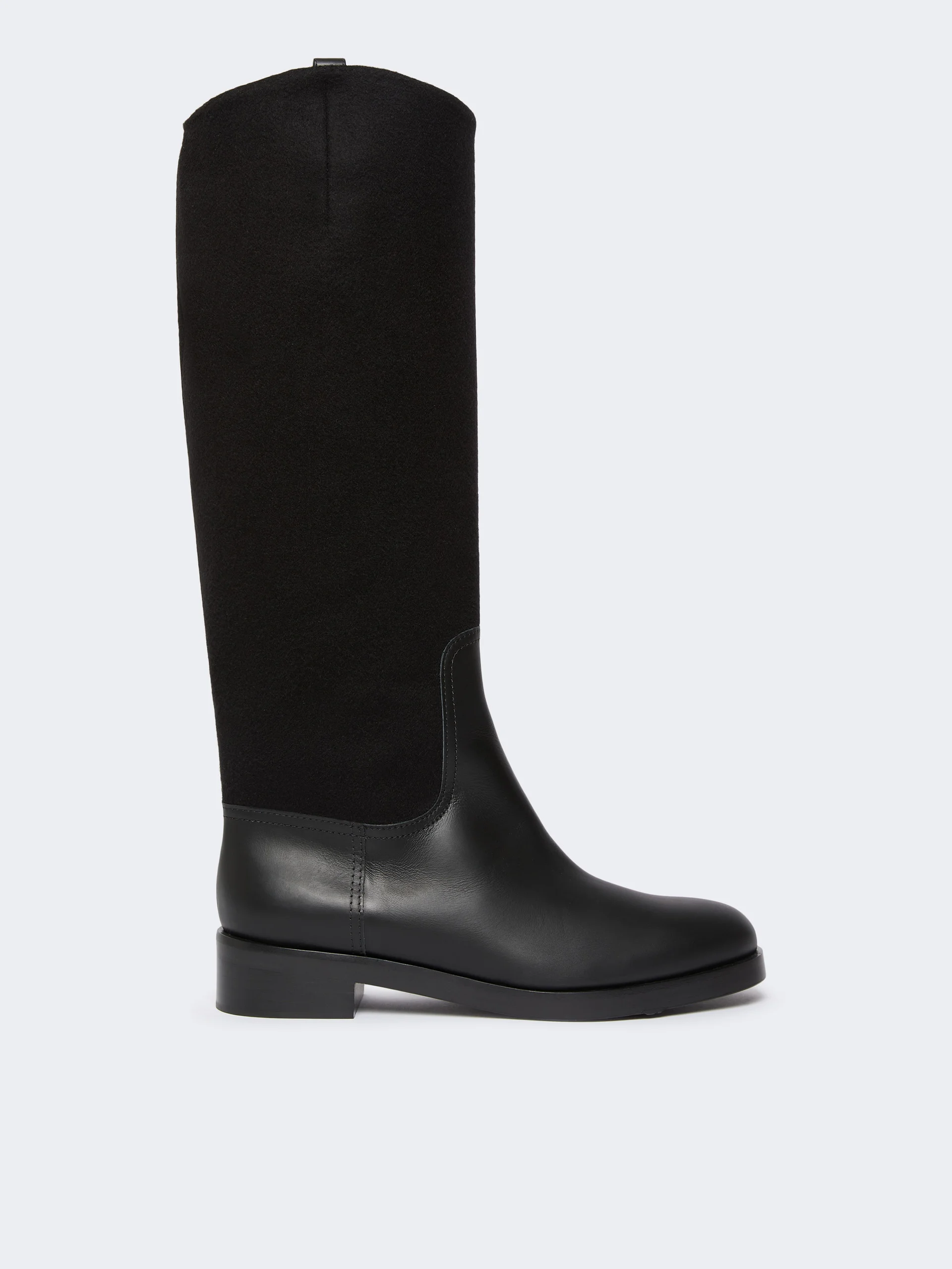 DETAILS Riding boots with tubular shaft and rounded toe. Boot in natural calfskin, with hand-finished mottled effect Boot shaft in lightweight, water-repellent pure camel drap Leather lining 2 cm monoblock heel Leather monoblock sole with non-slip rubber Monogram Double loop on the edge to facilitate putting on and taking off COMPOSITION AND CARE Upper in calf; upper in 100% camelwool; lining in calf; sole in leather. Distributed by Max Mara S.r.l., registered office in Reggio Emilia (Italy), Via Giulia Maramotti 4, 42124 (IT)