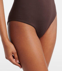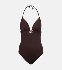 Max Mara's Cecilia swimsuit is primed for sunny days spent at the beach or by the pool. Made from smooth swim fabric, it features a low back, padded cups for support, and gleaming logo hardware on the front. Product Details - Material: 90% polyamide, 10% elastane - Care instructions: hand wash - Made in Tunisia - Designer color name: Cafe - Item color: brown - Comes with zipped pouch - Closure: self-ties - Lining: 90% polyamide, 10% elastane - Item number: P01035679 Size & Fit - True to size - Padded top - Medium-cut leg - The model seen in the picture is 178cm-5'10", cup size B, and wearing a size 1