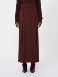 DETAILS Long faux-wrap skirt with high waistband and symmetrical pleated pattern on the front. Skirt in lightweight baby camel zibeline drap High-waisted style, slightly flared at the hem Back zip fastening Slant pockets at the sides Lined COMPOSITION AND CARE Fabric 100% camelwool; lining 95% acetate, 5% elastane. Do not wash; do not bleach; do not tumble dry; cool iron; professionally dry clean perchloroethylene - mild process; do not wet clean. Distributed by Max Mara S.r.l., registered office in Reggio Emilia (Italy), Via Giulia Maramotti 4, 42124 (IT)