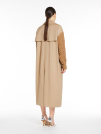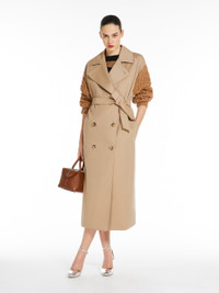 DETAILS Double-breasted trench coat made of lightweight water-repellent wool and cotton gabardine. The garment features long sleeves in a pure wool cable knit, dropped shoulder, lapel collar and welt pockets on the sides. Embellished with a storm shield on the back and a centre-back slit. The matching belt accentuates the silhouette. Lined in plain fabric and fastened with visible buttons. COMPOSITION AND CARE Fabric 62% virgin wool, 38% cotton; lining 52% viscose, 48% cotton; with knitted details 100% virgin wool; with knitted wristbands 95% virgin wool, 4% polyamide, 1% elastane. Do not wash; do not bleach; do not tumble dry; cool iron; professionally dry clean perchloroethylene - mild process; do not wet clean.; put this item into a string bag before washing it.; wash the garment while it is fastened.; do not iron the buttons.; protect buttons before washing.; turn the articles inside out before washing.; contains non-textile parts of animal origin. Distributed by Max Mara S.r.l., registered office in Reggio Emilia (Italy), Via Giulia Maramotti 4, 42124 (IT)