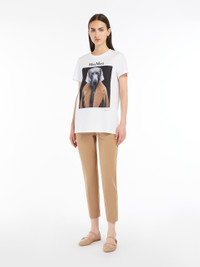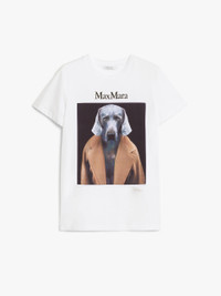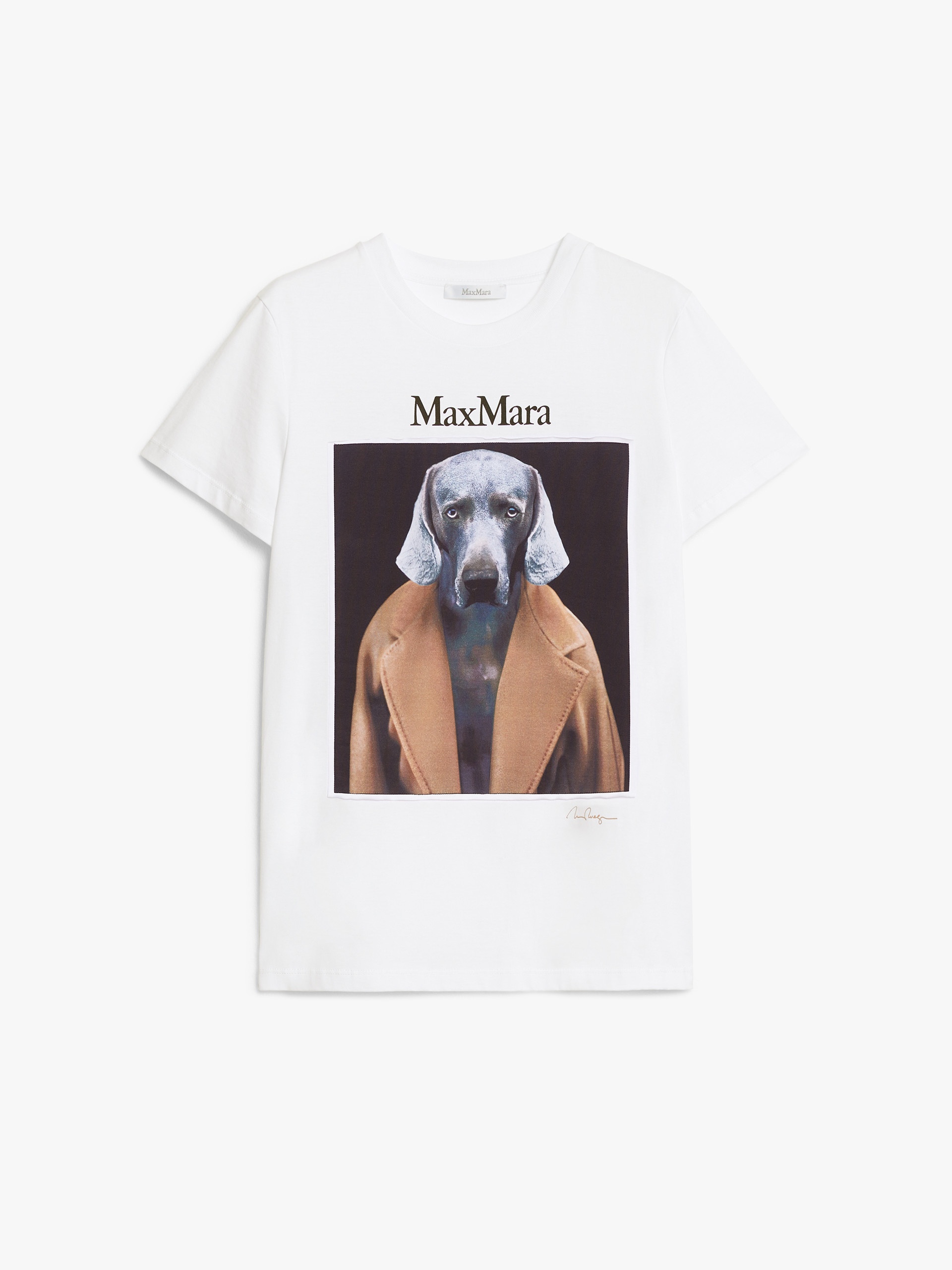 DETAILS Short-sleeved T-shirt made of soft, pure cotton jersey with contrasting Max Mara logo. The garment is customised, front and back, with the printed image of the artist William Wegman that portrays his Weimaraner wearing the iconic 101801 in the seasonal colours of the collection. Delivered with matching packaging box. COMPOSITION AND CARE 100% cotton. Hand wash cold; do not bleach; do not tumble dry; flat drying in the shade; cool iron; do not dry clean; do not wet clean.; iron with a cloth between.; using neutral detergent.; don’t rub.; turn the articles inside out before washing.; to be ironed on reverse. Distributed by Max Mara S.r.l., registered office in Reggio Emilia (Italy), Via Giulia Maramotti 4, 42124 (IT)