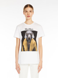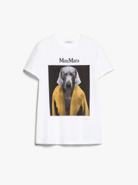 DETAILS Short-sleeved T-shirt made of soft, pure cotton jersey with contrasting Max Mara logo. The garment is customised, front and back, with the printed image of the artist William Wegman that portrays his Weimaraner wearing the iconic 101801 in the seasonal colours of the collection. Delivered with matching packaging box. COMPOSITION AND CARE 100% cotton. Hand wash cold; do not bleach; do not tumble dry; flat drying in the shade; cool iron; do not dry clean; do not wet clean.; iron with a cloth between.; using neutral detergent.; don’t rub.; turn the articles inside out before washing.; to be ironed on reverse. Distributed by Max Mara S.r.l., registered office in Reggio Emilia (Italy), Via Giulia Maramotti 4, 42124 (IT)