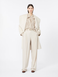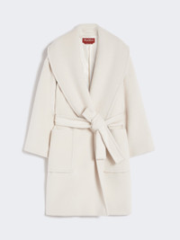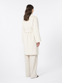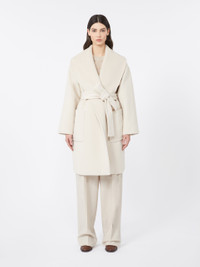 DETAILS Midi coat featuring a wide, soft shawl collar. Alpaca and wool beaver coat Relaxed, oversized line Long sleeves with dropped shoulders Fastens with a matching belt Large patch pockets at the front Embellished with tailored pick stitch Lined in Monogram jacquard fabric COMPOSITION AND CARE Fabric 77% alpaca, 23% virgin wool; lining 100% viscose. Do not wash; do not bleach; do not tumble dry; cool iron; professionally dry clean perchloroethylene - mild process; do not wet clean. Distributed by Max Mara S.r.l., registered office in Reggio Emilia (Italy), Via Giulia Maramotti 4, 42124 (IT)