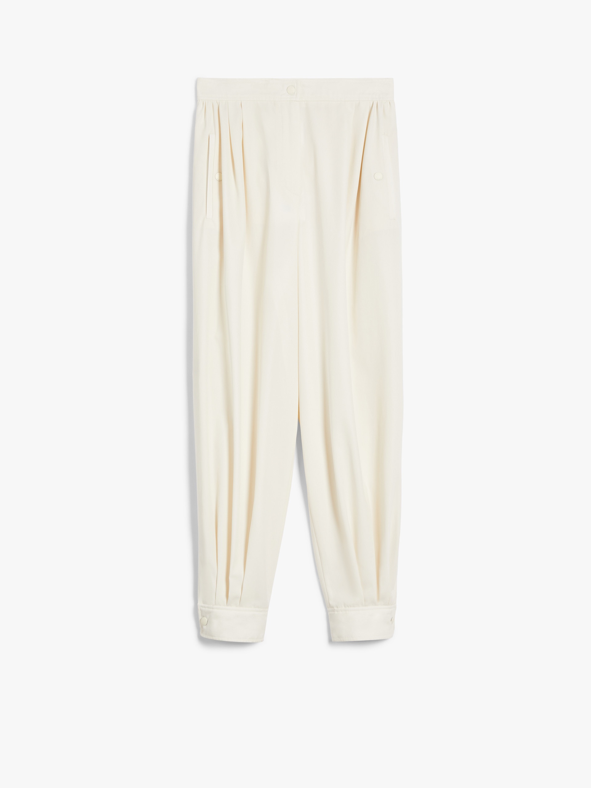 DETAILS High-waisted balloon trousers in extremely light flowing cotton, with double pleats on the front, buttoned welt pockets on the sides and welt pockets on the back. The style features an adjustable silhouette with a wide leg, deep side reverse pleat with snap-buttons on the sides and a buttoned ankle cuff. Concealed zip fastening with snap-button. COMPOSITION AND CARE 100% cotton. Do not wash; do not bleach; do not tumble dry; cool iron; professionally dry clean perchloroethylene - mild process; do not wet clean.; wash the garment while it is fastened.; protect buttons before washing.; turn the articles inside out before washing. Distributed by Max Mara S.r.l., registered office in Reggio Emilia (Italy), Via Giulia Maramotti 4, 42124 (IT)