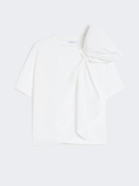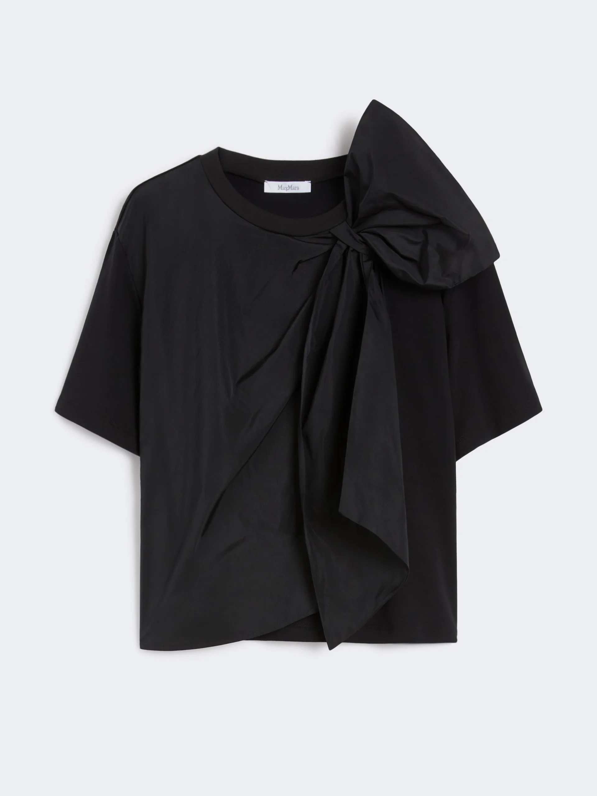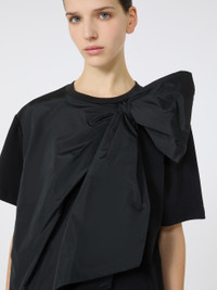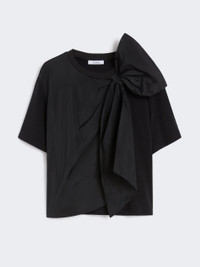 DETAILS Basic T-shirt with overlapping taffeta panel on the front and couture bow tied at the top, left side as worn. Heavy cotton jersey T-shirt Loose fit Crew neck Short set-in sleeves Straight hem COMPOSITION AND CARE Jersey fabric 100% cotton; fabric 75% polyester, 25% silk. Do not wash; do not bleach; do not tumble dry; cool iron; professionally dry clean perchloroethylene - mild process; do not wet clean.; iron with a cloth between. Distributed by Max Mara S.r.l., registered office in Reggio Emilia (Italy), Via Giulia Maramotti 4, 42124 (IT)
