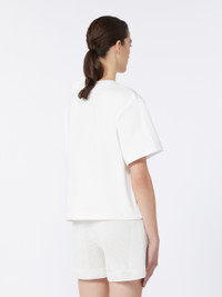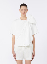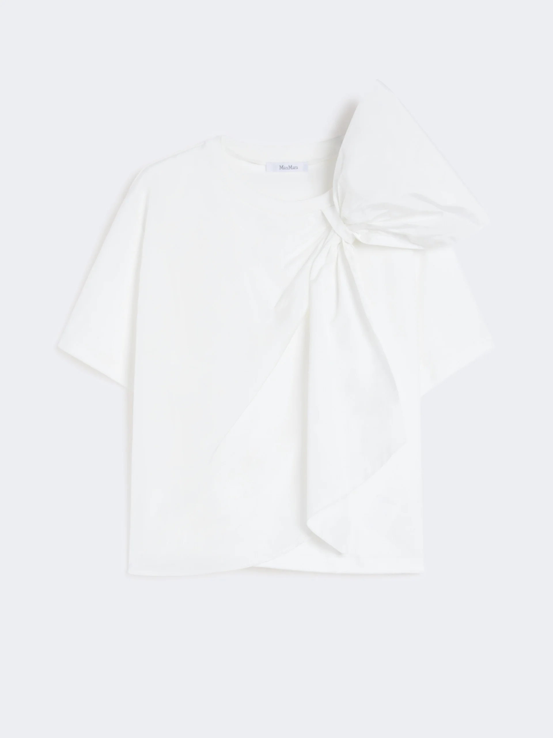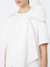 DETAILS Basic T-shirt with overlapping taffeta panel on the front and couture bow tied at the top, left side as worn. - Heavy cotton jersey T-shirt - Loose fit - Crew neck - Short set-in sleeves - Straight hem COMPOSITION AND CARE Jersey fabric 100% cotton; fabric 75% polyester, 25% silk. Do not wash; do not bleach; do not tumble dry; cool iron; professionally dry clean perchloroethylene - mild process; do not wet clean.; iron with a cloth between. Distributed by Max Mara S.r.l., registered office in Reggio Emilia (Italy), Via Giulia Maramotti 4, 42124 (IT)