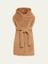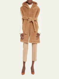 Max Mara "Corea" long stole in jersey, wool, and silk Hooded Two drawstrings Zip closure Selftying belt Diagonal slip pockets Dry clean Made in Italy