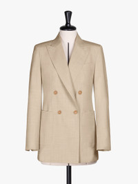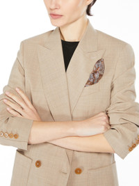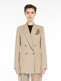 DETAILS Deconstructed double-breasted blazer made of luxurious melange wool canvas for exceptional stretch and comfort. The light weight and the canvas texture make it versatile, ensuring hold and fluidity of movement. The loose silhouette features a canvassed construction with a peak lapel collar, masculine breast pocket and patch pockets on the front. Semi-lined in contrasting ivory cupro, finished with pick stitch edge and lateral vents on the back. Corozo button fastening. COMPOSITION AND CARE Fabric 96% virgin wool, 4% elastane; lining 100% cupro; sleeves lining 65% viscose, 34% polyester, 1% cupro. Do not wash; do not bleach; do not tumble dry; cool iron; professionally dry clean perchloroethylene - mild process; do not wet clean.; turn the articles inside out before washing. Distributed by Max Mara S.r.l., registered office in Reggio Emilia (Italy), Via Giulia Maramotti 4, 42124 (IT)