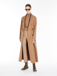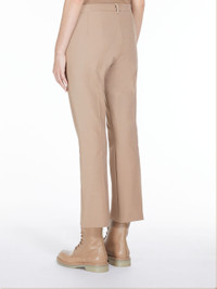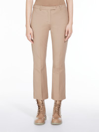DETAILS Slightly flared trousers in stretch cotton-blend fabric. Embellished with pressed pleat detail on the leg, in addition to belt loops. Extended waist tab, complete with a placket-covered zip and hook-and-bar fastening. Length: 94 cm. COMPOSITION AND CARE 52% cotton, 41% polyamide, 7% elastane. Machine wash cold delicate cycle; do not bleach; do not tumble dry; line drying in the shade; cool iron; professionally dry clean perchloroethylene - mild process.; wash the garment while it is fastened.; do not iron the buttons.; contains non-textile parts of animal origin. Distributed by Max Mara S.r.l., registered office in Reggio Emilia (Italy), Via Giulia Maramotti 4, 42124 (IT)