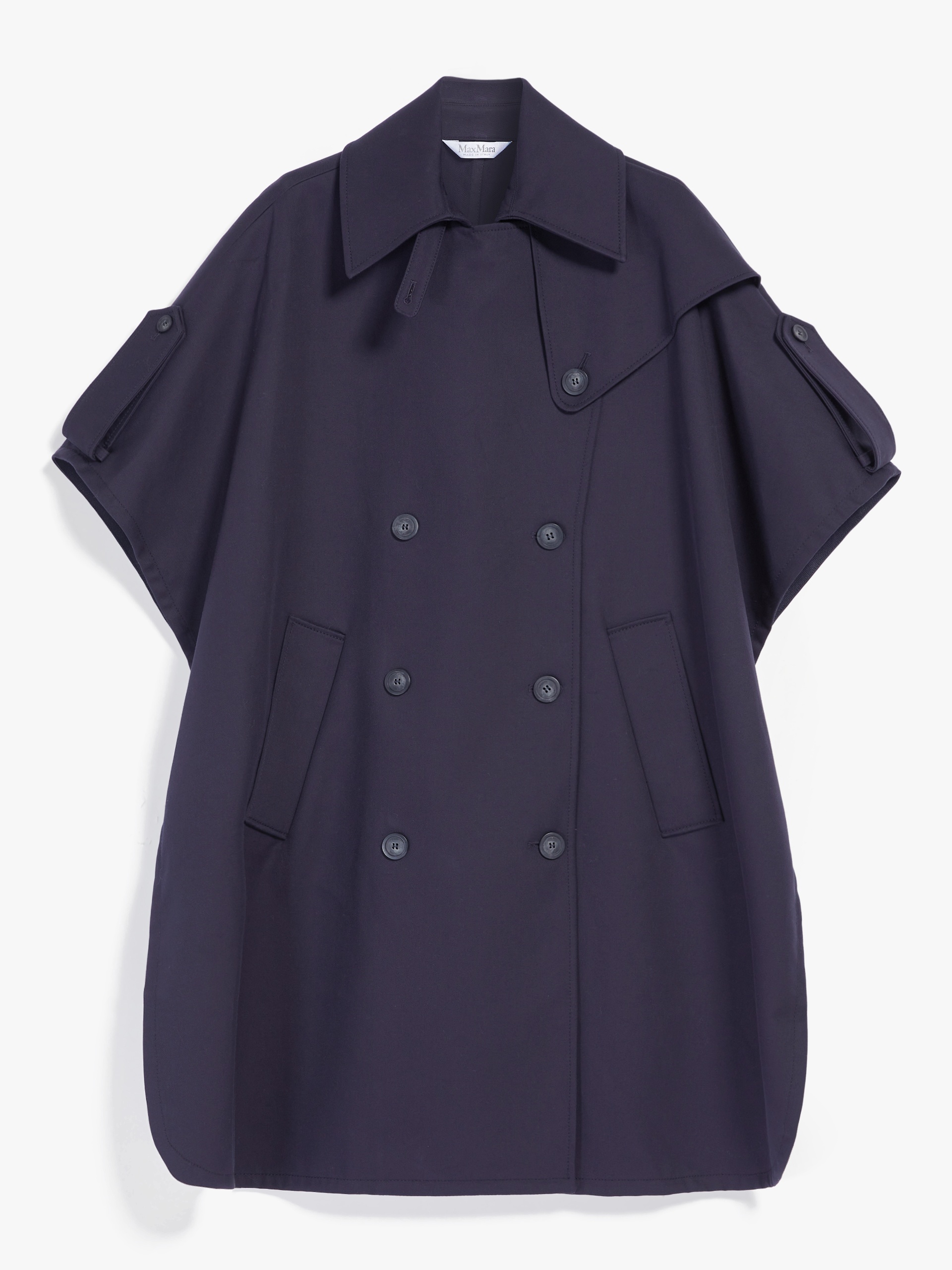 DETAILS Trench-style cape in waterproof pure cotton fabric, with shirt collar, short kimono sleeves, epaulettes and welt pockets on the sides. Double-breasted button fastening. Lenght: 97 cm. COMPOSITION AND CARE Fabric 100% cotton; - except joining thread. Do not wash; do not bleach; do not tumble dry; cool iron; professionally dry clean perchloroethylene - mild process; do not wet clean.; remove the cufflinks before washing. Distributed by Max Mara S.r.l., registered office in Reggio Emilia (Italy), Via Giulia Maramotti 4, 42124 (IT)