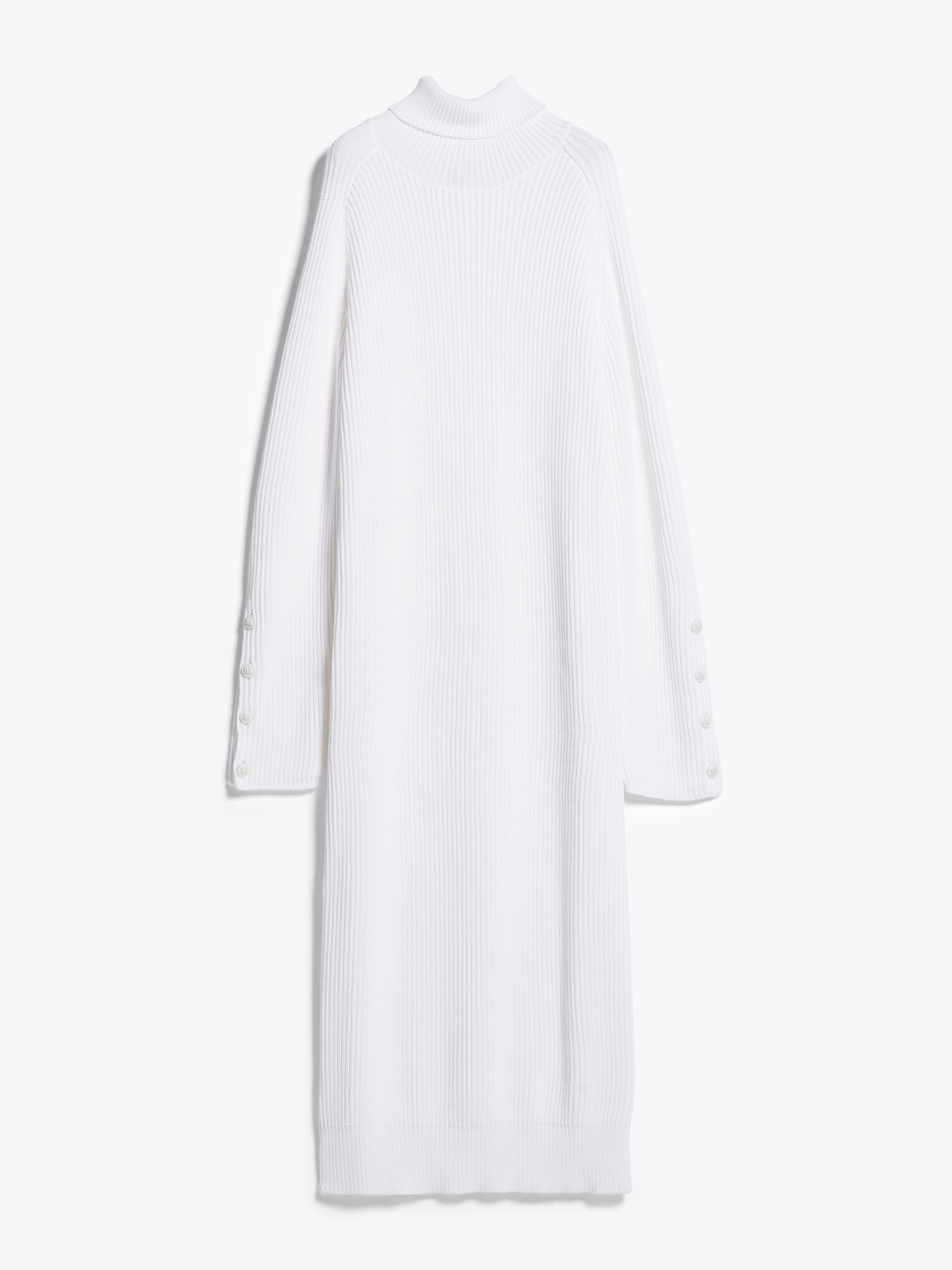 DETAILS Long dress in English ribbed cotton cordonetto knit, with high neck and long raglan sleeves with M buttons on the side in matt enamelled metal at the wrist. Straight with a regular fit. Length: 118 cm. COMPOSITION AND CARE 67% cotton, 33% nylon. Hand wash cold; do not bleach; do not tumble dry; flat drying in the shade; cool iron; professionally dry clean perchloroethylene - mild process; do not wet clean.; iron with a cloth between.; using neutral detergent.; protect buttons before washing.; turn the articles inside out before washing. Distributed by Max Mara S.r.l., registered office in Reggio Emilia (Italy), Via Giulia Maramotti 4, 42124 (IT)