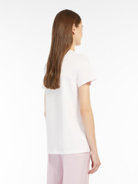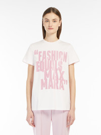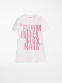 DETAILS Short-sleeved T-shirt in pure cotton jersey with contrasting slogan print on the front. Straight cut. COMPOSITION AND CARE 100% cotton. Hand wash cold; do not bleach; do not tumble dry; flat drying in the shade; cool iron; do not dry clean; do not wet clean.; iron with a cloth between.; iron into original measurements.; using neutral detergent.; don’t rub.; turn the articles inside out before washing.; to be ironed on reverse. Distributed by Max Mara S.r.l., registered office in Reggio Emilia (Italy), Via Giulia Maramotti 4, 42124 (IT)